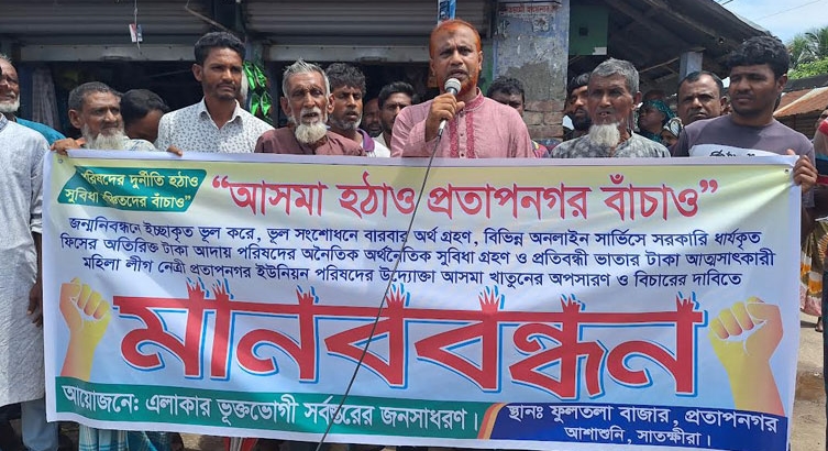 এসময় বক্তারা বলেন, “জন্মনিবন্ধনে ইচ্ছাকৃত ভুল, ভুল সংশোধনের নামে বারবার অর্থ গ্রহণ, প্রতিবন্ধী ও বয়স্ক ভাতার টাকা নিজের পরিবারের নাম্বার দিয়ে আত্মসাৎ করা, বিভিন্ন অনলাইন সার্ভিসে সরকারি ধার্যকৃত ফিসের অতিরিক্ত টাকা আদায় করা, পরিষদের অনৈতিক অর্থনৈতিক সুবিধা আদায়, প্রতাপনগর ইউনিয়ন পরিষদের উদ্যোক্তা মহিলা লীগ ইউনিয়নের মহিলা বিষয়ক সম্পাদক আসমা খাতুনের অপসারণ ও বিচারের করতে হবে, তা না হলে এরপরে সাতক্ষীরা জেলা প্রশাসকের কার্যালয়ে বৃহত্তর কর্মসূচি করা হবে।”