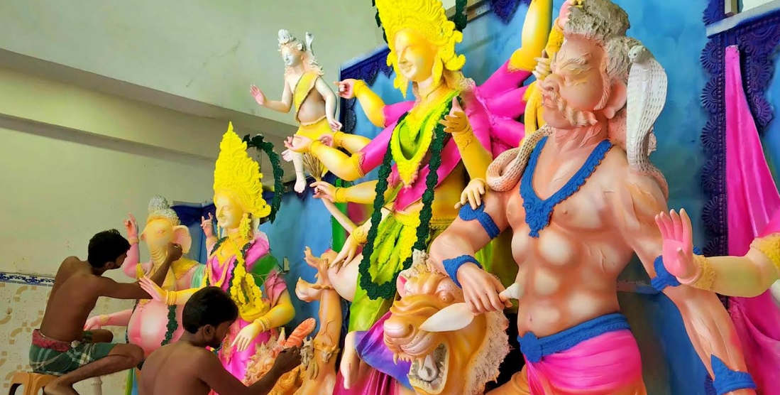 এ বছর ২১ সেপ্টেম্বর মহালয়ার মধ্য দিয়ে শুরু হচ্ছে দেবীপক্ষ। আগামী ২৮ সেপ্টেম্বর মহাষষ্ঠীর মাধ্যমে শুরু হতে যাওয়া দুর্গাপুজায় চারদিকে এখনই শুরু হয়েছে উৎসবের আমেজ।এ উৎসবকে ঘিরে দেবী দুর্গাকে বরণ করে নিতে মণ্ডপ মণ্ডপে চলছে নানা প্রস্তুতি। শেষ মুহুর্তে প্রতিমা শিল্পীরা কল্পনায় দেবী দুর্গার অনিন্দ্যসুন্দর রূপ দিতে রাতভর প্রতিমা তৈরির কাজ করছেন। নিখুঁত হাতের কারুকার্য দিয়ে সকাল থেকে গভীর রাত পর্যন্ত তৈরি করছেন প্রতিমা। পূজার সময় ঘনিয়ে আসার সঙ্গে সঙ্গেই ব্যস্ত হয়ে পড়ছেন প্রতিমা শিল্পীরা।