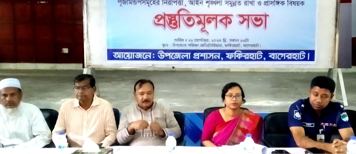 ফকিরহাট প্রতিনিধি : শারদীয় দুর্গোৎসব আসন্ন। বাগেরহাটের ফকিরহাটে এবার ৬৮টি পূজা মন্ডপে দুর্গাপূজা অনুষ্ঠিত হবে। এ উপলক্ষে পূজা মন্ডপসমূহে নিরাপত্তা, আইনশৃঙ্খলা সমুন্নত রাখা ও প্রাসঙ্গিক বিষয়ক প্রস্তুতিমুলক সভা অনুষ্ঠিত হয়েছে। এদিন সকল মন্দিরের ৫’শ কেজি করে চালের ডিও প্রদান করা হয়। উপজেলা প্রশাসনের আয়োজনে সোমবার (২২ সেপ্টেম্বর) বেলা ১১টায় উপজেলা পরিষদ অডিটোরিয়ামে অনুষ্ঠিত সভায় সভাপতিত্ব করেন উপজেলা নির্বাহী কর্মকর্তা সুমনা আইরিন। সভায় অন্যদের মধ্যে বক্তব্য রাখেন সহকারী কমিশনার (ভূমি) এএসএম শাহনেওয়াজ মেহেদী, ভারপ্রাপ্ত কর্মকর্তা (ওসি) আবদুর রাজজাক মীর, উপজেলা আনসার ও ভিডিপি কর্মকর্তা আশালতা মন্ডল, ফকিরহাট ফায়র সার্ভিসের ভারপ্রাপ্ত স্টেশন কর্মকর্তা শাহাজান মিয়া, উপজেলা বিএনপির সভাপতি শেখ কামরুল ইসলাম গোরা, সাধারন সম্পাদক শেখ শরিফুল কামাল কারিম, জামায়াতে ইসলামী বাংলাদেশ উপজেলা শাখার আমীর মাও: এবিএম তৈয়বুর রহমান, এনসিপির সভাপতি মো. মিজানুর রহমান, ফকিরহাট হিন্দু, বৌদ্ধ ও খ্রীস্টান কণ্যাণ ফ্রন্টের সভাপতি ডা. শাবনাথ রায় প্রমূখ। এসময় উপজেলা কৃষি সম্প্রসারণ কর্মকর্তা কৃষিবিদ মো: তৌহিদুল ইসলাম, উপজেলা যুব উন্নয়ন কর্মকর্তা আমরুল কায়েস, পল্লী বিদ্যুতের ফকিরহাট জোনাল অফিসের ডিজিএম আনন্দ কুমার কুন্ডুসহ বিভিন্ন সরকারি কর্মকর্তা, পূজা মন্দির কমিটির সভাপতি ও সাধারন সম্পাদকবৃন্দ উপস্থিত ছিলেন। সভায় বক্তারা পূজাকে ঘিরে আইনশৃঙ্খলা রক্ষা, বিদ্যুৎ ও আলোকসজ্জা, ইভটিজিং ও নিরাপত্তা ব্যবস্থা নিশ্চিত করার ওপর গুরুত্বারোপ করেন। সভায় জানানো হয়, এ বছর ফকিরহাট উপজেলায় মোট ৬৮টি পূজামণ্ডপে শারদীয় দুর্গাপূজা অনুষ্ঠিত হবে। পূজাকে সুষ্ঠু, সুন্দর, শান্তিপূর্ণ ও উৎসব মুখরভাবে সম্পন্ন করার জন্য প্রশাসনের পক্ষ থেকে প্রয়োজনীয় দিকনির্দেশনা প্রদান করা হয়।