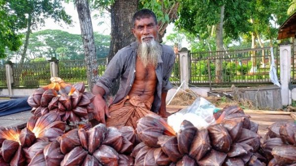 ভ্যান চালিয়ে জীবিকা নির্বাহ করতেন বাগেরহাট সদর উপজেলার সুন্দরঘোনা গ্রামের বাসিন্দা আব্দুর রহমান শেখ। প্রায় নয় বছর আগে গ্যাংগ্রিনে আক্রান্ত হয়ে দুই পা হারান তিনি। পঙ্গু অবস্থায় ভ্যান টেনে ছয় ছেলে-মেয়েসহ সংসারের খরচ বহন করতে যখন হিমশিম খাচ্ছিলেন তখনই এই গোলফল বিক্রির চিন্তা মাথায় আসে তার। বছর চারেক আগে ছোট ছেলেকে নিয়ে আশেপাশের এলাকার নদীর পাড়ে জন্মানো গোল গাছ থেকে ফলের কাঁদি কেটে এনে ষাটগম্বুজ মসজিদের সামনে বিক্রি করতে শুরু করেন তিনি।