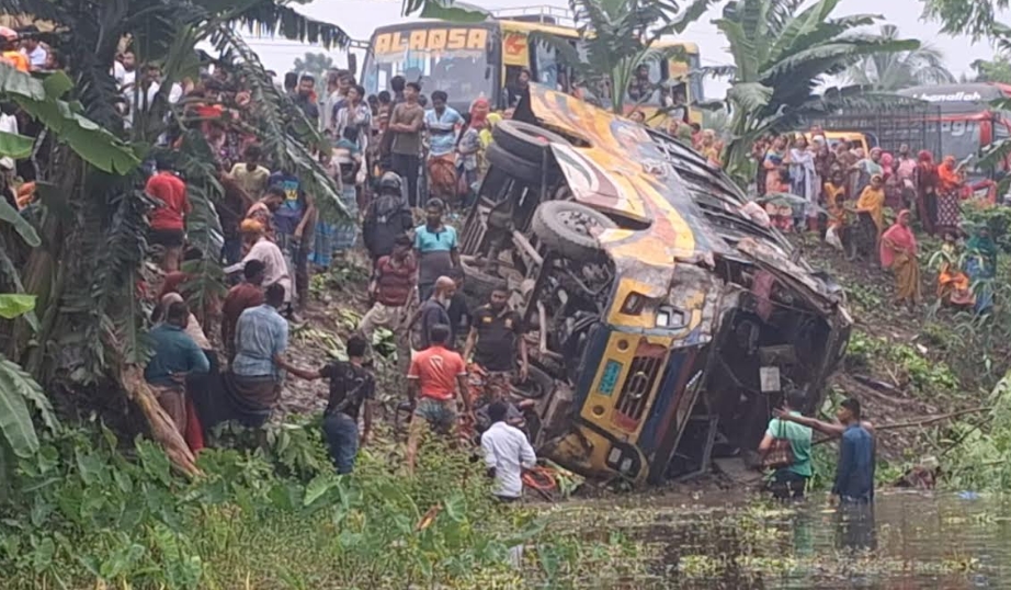 নড়াইল প্রতিনিধি: নড়াইল সদর উপজেলায় যাত্রীবাহী বাস ও ট্রাকের মুখোমুখি সংঘর্ষে নারী ও শিশু সহ অন্তত ১৫ জন আহত হয়েছেন। শুক্রবার (১০ অক্টোবর) বিকেলে নড়াইল–যশোর মহাসড়কের তুলারামপুর হাইওয়ে থানার সামনে এ দুর্ঘটনা ঘটে। তুলারামপুর হাইওয়ে থানার পুলিশ সার্জেন্ট ইমরান আলী বিষয়টি নিশ্চিত করেছেন। আহতদের মধ্যে রয়েছেন— ট্রাকচালক এনামুল হক, কবিতা, সাথী, রিজিয়া, আন্না, আরিয়ান, রত্না, কল্পনা, আরজিনা, মিনতী, সুভদ্রা, অনিমা, আকাশ, সুলতানা ও উর্মিলা প্রমুখ। প্রত্যক্ষদর্শী ও পুলিশ জানায়, নড়াইল থেকে ছেড়ে যাওয়া একটি আন্তঃজেলা যাত্রীবাহী বাস যশোরের দিকে যাচ্ছিল। এ সময় বিপরীত দিক থেকে আসা বেনাপোলগামী মালবোঝাই বিআরটিসির একটি ট্রাকের সঙ্গে বাসটির মুখোমুখি সংঘর্ষ হয়। সংঘর্ষের পর বাসটি নিয়ন্ত্রণ হারিয়ে সড়ক থেকে ছিটকে পাশের পুকুরে পড়ে যায়। খবর পেয়ে স্থানীয়রা দ্রুত আহতদের উদ্ধার করে নড়াইল সদর হাসপাতালে পাঠান। পরে হাইওয়ে থানা পুলিশ ও ফায়ার সার্ভিস ঘটনাস্থলে উপস্থিত হয়ে উদ্ধার কার্যক্রম চালায়। বাসের ভেতরে আটকে পড়া কয়েকজন যাত্রীকে ফায়ার সার্ভিসের সদস্যরা উদ্ধার করে হাসপাতালে নিয়ে যান। নড়াইল সদর হাসপাতালের জরুরি বিভাগের চিকিৎসক শরীফ মো. হাসান ফেরদৌস জানান, দুর্ঘটনায় আহত ১৫ জনকে হাসপাতালে ভর্তি করা হয়েছে। প্রাথমিক চিকিৎসা শেষে তাদের মধ্যে গুরুতর আহত ট্রাকচালক এনামুল হক ও উর্মিলাকে উন্নত চিকিৎসার জন্য খুলনায় পাঠানো হয়েছে। তুলারামপুর হাইওয়ে থানার সার্জেন্ট ইমরান আলী বলেন, “দুর্ঘটনার খবর পেয়ে আমরা দ্রুত ঘটনাস্থলে পৌঁছাই। ফায়ার সার্ভিসের দল উদ্ধার কাজ সম্পন্ন করেছে। বর্তমানে নড়াইল–যশোর মহাসড়কে যান চলাচল স্বাভাবিক রয়েছে।”