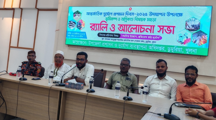 বক্তব্য দেন ডুমুরিয়া উপজেলা বাস্তবায়ন কর্মকর্তা মোঃ বাইজিদ আব্দুল্লাহ, ডুমুরিয়া উপজেলা ফায়ার সার্ভিস স্টেশন কর্মকর্তা মোঃ আব্দুস সাত্তার, ডুমুরিয়া প্রেসক্লাবের সাধারণ সম্পাদক শেখ মাহতাব হোসেন,ডুমুরিয়া মাধ্যমিক বিদ্যালয়ের প্রধান শিক্ষক মোঃ মোজাহার আলী, ডুমুরিয়া সরকারি বালিকা উচ্চবিদ্যালয় শিক্ষক মোঃ তৈয়বুর রহমান, ডুমুরিয়া উপজেলা সদর ইউনিয়নের চেয়ারম্যান গাজী হুমায়ূন কবির বুলু ,বিশ্বব্যাপী দুর্যোগের ঝুঁকি হ্রাসে জনগণের সচেতনতা বৃদ্ধি ও বিপদ মোকাবিলায় প্রস্তুতি জোরদারের লক্ষ্যে প্রতিবছর ১৩ অক্টোবর পালিত হয় ‘আন্তর্জাতিক দুর্যোগ প্রশমন দিবস’। দিবসটির এ বছরের প্রতিপাদ্য ‘সমন্বিত উদ্যোগ, প্রতিরোধ করি দুর্যোগ’।