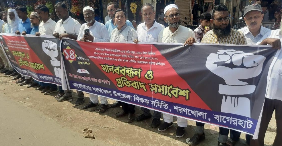 শরণখোলা আঞ্চলিক অফিস : শরণখোলায় মঙ্গলবার ক্লাশ বর্জন করে এমপিও ভুক্ত শিক্ষকরা কর্মবিরতি পালন করেছে। এসময় তিন দফা দাবিতে উপজেলা শিক্ষক সমিতি উপজেলা সদর রায়েন্দা বাজার পাঁচরাস্তা মোড়ে মানববন্ধন ও প্রতিবাদ সমাবেশ করে তারা। সকাল ১১ টায় অনুষ্ঠিত মানববন্ধনে শিক্ষকরা বলেন, তাদের ন্যায্য দাবি আদায় না হওয়া পর্যন্ত তারা এই আন্দোলন কর্মসূচি চালিয়ে যাবেন। মানববন্ধনে সভাপতিত্ব করেন শরণখোলা উপজেলা শিক্ষক সমিতির সভাপতি রাজাপুর মাধ্যমিক বিদ্যালয়ের প্রধান শিক্ষক মোঃ নান্না মিয়া বিএসসি। সহকারী অধ্যাপক আঃ মালেক রেজার সঞ্চালনায় মানববন্ধনে অন্যান্যের মধ্যে বক্তব্য রাখেন,শিক্ষক আবুল কালাম,মোঃ বেলাল হোসেন,মাওলানা মনিরুজ্জামান, এটিএম কামাল হোসেন,আবিদুর রহমান, মোঃ আলআমিন,মোঃ নজরুল ইসলাম ও মাওলানা নুরুল আমীন প্রমূখ। এদিকে, শিক্ষকদের কর্ম বিরতির কারণে উপজেলায় এমপিও ভুক্ত বিদ্যালয়ের শ্রেণিকক্ষ ফাঁকা ছিল। স্কুলের ছাত্র-ছাত্রী উপস্থিত হলেও কোন ক্লাস হয়নি। আরকেডিএস পাইলট বালিকা বিদ্যালয়, আনোয়ার হোসেন মাধ্যমিক বিদ্যালয়, তাফালবাড়ী কলেজিয়েট স্কুলসহ কয়েকটি স্কুলে গিয়ে দেখা গেছে ছাত্র-ছাত্রীরা খোলা মাঠে ঘুরে বেড়াচ্ছে, শিক্ষকরা ক্লাশ বর্জন করে প্রতিবাদ সমাবেশ ও মানববন্ধনে অংশ নিয়েছেন।