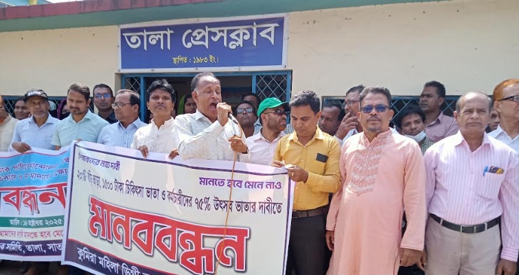 তালা প্রতিনিধি : সাতক্ষীরার তালায় বেসরকারি এমপিওভুক্ত শিক্ষক-কর্মচারীদের তিন দফা দাবি বাস্তবায়ন ও ঢাকায় আন্দোলনরত শিক্ষকদের ওপর হামলার প্রতিবাদে মানববন্ধন কর্মসূচি পালিত হয়েছে। শিক্ষকদের মূল বেতনের ওপর ২০ শতাংশ বাড়িভাড়া, ১ হাজার ৫ শত টাকা চিকিৎসা ভাতা এবং কর্মচারীদের উৎসব ভাতা ৭৫ শতাংশে উন্নীত করার দাবিতে এ কর্মসূচি পালন করা হয়। বৃহস্পতিবার (১৬ অক্টোবর) সকাল ১১টার দিকে তালা প্রেসক্লাবের সামনে ঘণ্টাব্যাপী মানববন্ধন কর্মসূচীতে এমপিওভুক্ত স্কুল, কলেজ, মাদ্রাসা ও কারিগরি শিক্ষা প্রতিষ্ঠানের শিক্ষক-কর্মচারীরা অংশগ্রহণ করেন। প্রভাষক মোস্তাফিজুর রহমানের সঞ্চালনায় অনুষ্ঠানে বক্তব্য রাখেন তালা ডিগ্রি কলেজের ভারপ্রাপ্ত অধ্যক্ষ সেখ শফিকুল ইসলাম, সাবেক অধ্যক্ষ আব্দুর রহমান, সুভাষিনী কলেজের অধ্যক্ষ কামরুল ইসলাম সেলিম, শালিখা কলেজের অধ্যক্ষ বিধান চন্দ্র সাধু, ভারপ্রাপ্ত অধ্যক্ষ আব্দুল গফুর, ভারপ্রাপ্ত অধ্যক্ষ আরিফুল ইসলাম, অধ্যাপক নিলুফার বানু, তালা উপজেলা মাধ্যমিক শিক্ষক সমিতির আহবায়ক মইনুল ইসলাম, সাবেক সভাপতি জগদীশ হালদার, শিক্ষক নেতা মানিক চন্দ্র নাথ, হাছিবুর রহমান, মোঃ মতিয়ার রহমান, জাহাঙ্গীর হাসান, আব্দুস সামাদ সেলিম, মতিউর রহমান, শ্যামল চৌধুরী, অরুণ কুমার আইচ, মোঃ কামরুজ্জামান, সোনালী রাণী, রবিউল ইসলাম, নুর মোহাম্মদ পাড় প্রমুখ।