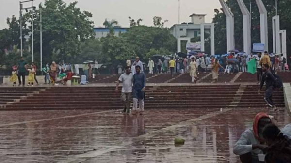 শিক্ষকরা শহীদ মিনারের বেদিতে জড়ো হয়েছেন। তারা বৃষ্টিতে ভিজে স্লোগান দিচ্ছেন, কেউ বক্তব্য রাখছেন।