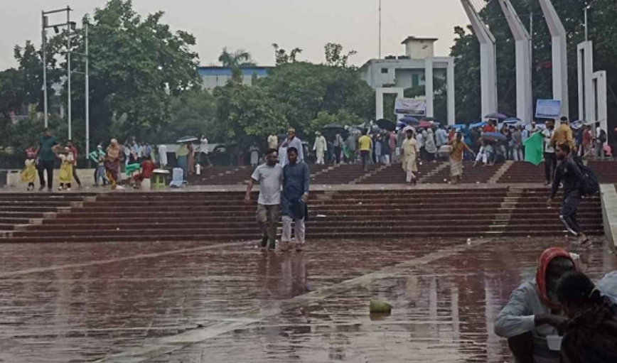 শিক্ষকরা শহীদ মিনারের বেদিতে জড়ো হয়েছেন। তারা বৃষ্টিতে ভিজে স্লোগান দিচ্ছেন, কেউ বক্তব্য রাখছেন।