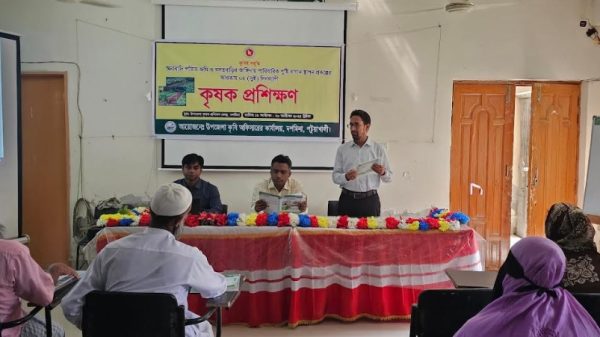 দশমিনা (পটুয়াখালী) প্রতিনিধি : পটুয়াখালীর দশমিনা উপজেলায় কৃষি সম্প্রসারন অধিদপ্তরের আয়োজনে অনাবাদি পতিত জমি ও বসতবাড়ির আঙ্গিনায় পারিবারিক পুষ্টি বাগান স্থাপন প্রকল্পের আওতায় ২ দিনব্যাপী কৃষক প্রশিক্ষন অনুষ্ঠিত হয়। উপজেলা কৃষক প্রশিক্ষন কেন্দ্রে উপজেলার ৭টি ইউনিয়নের প্রায় অর্ধ শতাধিক কৃষক প্রশিক্ষনে অংশ নেয়। উপজেলায় খরিপ-২/২০২৫-২৬ মৌসুমে অনাবাদি পতিত জমি ও বসতবাড়ির আশেপাশে সবজি ফসল আবাদ বৃদ্ধির লক্ষ্যে ক্ষুদ্র এবং প্রান্তিক কৃষকদেরকে এই প্রশিক্ষন দেয়া হয়। উপজেলা কৃষি কর্মকর্তা কৃষিবিদ মো. জাফর আহমেদ’র সভাপতিত্বে অনুষ্ঠিত প্রশিক্ষন অনুষ্ঠানে প্রধান অতিথি ছিলেন জেলার কৃষি সম্প্রসারন অধিদপ্তরের উপপরিচালক (শস্য) মো.শাহাদাত হোসেন। অনুষ্ঠানে অন্যান্যদের মধ্যে উপস্থিত ছিলেন উপজেলা সহকারী কৃষি কর্মকর্তা মো. আনোয়ার হোসেন, উপসহকারী কৃষি কর্মকর্তা রবি ফয়সাল প্রমুখ।