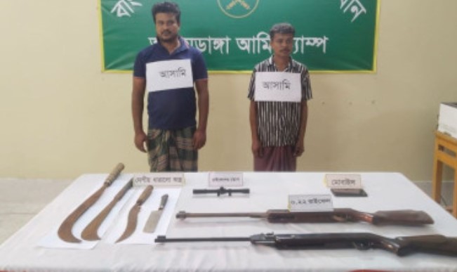 ডেস্ক রিপোর্ট : চুয়াডাঙ্গার আলমডাঙ্গায় সেনাবাহিনী ও পুলিশের যৌথ অভিযানে আগ্নেয়াস্ত্রসহ দুই যুবককে গ্রেপ্তার করা হয়েছে। শুক্রবার (২৪ অক্টোবর) ভোরে পৌর এলাকার এরশাদপুর গ্রামে অভিযান চালিয়ে তাদের গ্রেপ্তার করা হয়। গ্রেপ্তাররা হলেন ওই গ্রামের মৃত বজলুর রহমানের ছেলে রুহুল আমিন এবং নওদা বন্ডবিল গ্রামের ঠান্ডুর রহমানের ছেলে তারিফ হাসান। ঘটনার সত্যতা নিশ্চিত করে আলমডাঙ্গা থানার ভারপ্রাপ্ত কর্মকর্তা (ওসি) বলেন, ‘গোপন সংবাদের ভিত্তিতে আলমডাঙ্গার হারদী ক্যাম্পের সেনাবাহিনী ও থানা পুলিশের একটি যৌথ দল ভোরে এরশাদপুর গ্রামে অভিযান চালায়। এ সময় স্থানীয় রুহুল আমিনের বাড়ি থেকে একটি ০.২২ রাইফেল, একটি রাইফেলের বডি, একটি রাইফেল স্কোপ ও তিনটি দেশীয় ধারালো অস্ত্র উদ্ধার করা হয়। এ ঘটনায় রুহুল আমিন ও তারিফ হাসান নামের দুই যুবককে আটক করা হয়।’ তিনি আরো জানান, পরে আগ্নেয়াস্ত্রসহ আটকদের থানায় সোপর্দ করা হয়েছে। এ ঘটনায় থানার এসআই নিয়ামুল বাদী হয়ে অস্ত্র আইনে তাদের বিরুদ্ধে মামলা করেন। পরে তাদের আদালতে পাঠানো হয়।