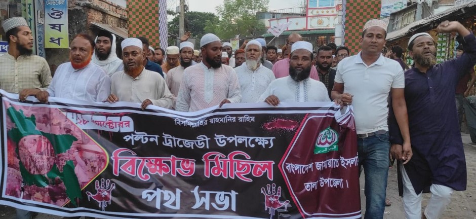 তালায় জামায়াতের উদ্যোগে পল্টন ট্রাজেডি উপলক্ষ্যে বিক্ষোভ মিছিল ও পথসভা