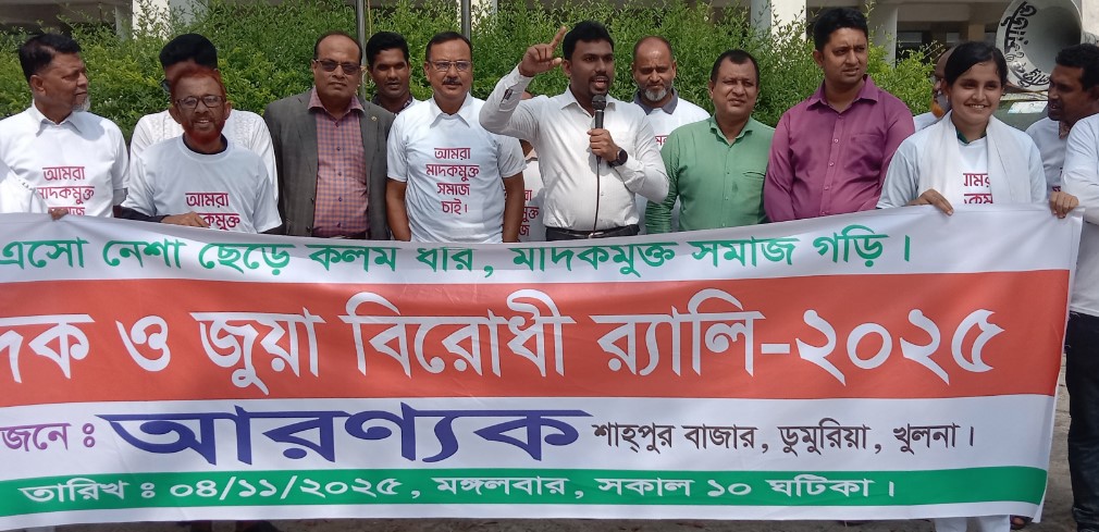 ডুমুরিয়া প্রতিনিধি : "এসো নেশা ছেড়ে কলম ধরি,মাদক মুক্ত সমাজ গড়ি" এ প্রতিপাদ্যকে সামনে রেখে ডুমুরিয়ায় বেসরকারি স্বেচ্ছাসেবী ও সৃজনশীল সংস্থা আরণ্যক'র আয়োজনে মাদক ও জুয়া বিরোধী এক র্যালি ও আলোচনা সভা অনুষ্ঠিত হয়েছে। মঙ্গলবার সকালে র্যালিটি খুলনা সাতক্ষীরা মহাসড়ক প্রদক্ষিণ শেষে উপজেলা পরিষদের সামনে জিল্লুর রহমানের উপস্থাপনায় বক্তব্য দেন উপজেলা সহকারি কমিশনার (ভূমি) অমিত কুমার বিশ্বাস,কৃষি কর্মকর্তা ইনসাদ ইবনে আমিন,সমাজসেবা কর্মকর্তা সুব্রত বিশ্বাস,যুব উন্নয়ন কর্মকর্তা এসএম কামরুজ্জামান,সোনামুখ পরিচালক এ এম কামরুল ইসলাম, জিএম আমানউল্লাহ,মিলন রহমান,এম এ জিন্নাত আলী, মুহসিন আলী প্রমুখ।