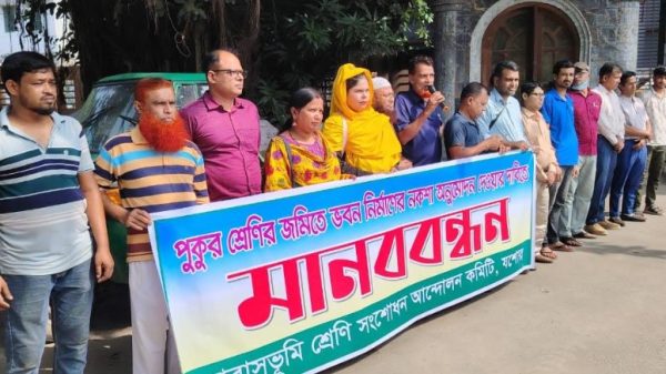 যশোর অফিস : পুকুর শ্রেণির জমিতে বাড়ির নকশা (প্লান) অনুমোদনের দাবিতে যশোরে মানববন্ধন অনুষ্ঠিত হয়েছে। বুধবার সকাল ১১টার দিকে যশোর পৌরসভা চত্বরে ‘আবাসভূমি শ্রেণি সংশোধন আন্দোলন কমিটি, যশোর’-এর উদ্যোগে এ মানববন্ধন অনুষ্ঠিত হয়। এতে ক্ষতিগ্রস্ত জমির মালিকরা ব্যানার-ফেস্টুন নিয়ে অংশ নেন। আন্দোলন কমিটির সদস্য আব্দুল মতিনের নেতৃত্বে ঘন্টাব্যাপী এই কর্মসূচিতে বক্তারা বলেন, জমি ক্রয়ের সময় ‘পুকুর শ্রেণি’ হিসেবে শ্রেণিবিন্যাস থাকা সত্ত্বেও সেখানে ভবন নির্মাণে কোনো সরকারি বাধা ছিল না। অনেকে পৌর কর্তৃপক্ষের মৌখিক অনুমতি নিয়ে ভবন নির্মাণও শুরু করেছিলেন। কিন্তু ২০২২ সালে হঠাৎ করে পৌরসভা কর্তৃপক্ষ জানায়, পুকুর শ্রেণির জমিতে আর প্লান অনুমোদন দেওয়া সম্ভব নয়। এরপর থেকে জমির মালিকদের সব নির্মাণকাজ বন্ধ হয়ে যায়। আন্দোলনকারীরা বলেন, জমির শ্রেণি সংশোধন ও পুকুর শ্রেণির জমিতে ভবন নির্মাণের অনুমতি পুনর্বহাল করা না হলে, সরকার যেন এই জমিগুলো অধিগ্রহণ করে নেয়Ñএ দাবি জানান তারা। মানববন্ধনে অংশ নেওয়া জমির মালিকরা বলেন, “আমরা কোনো অবৈধ কিছু চাই না, শুধু আমাদের বৈধ জমিতে ঘর বানানোর অধিকার ফিরিয়ে দিন।”