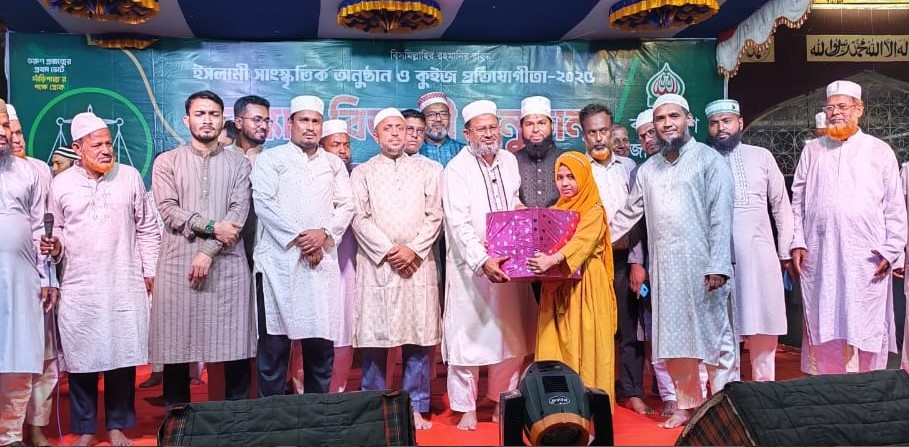 বিজ্ঞপ্তি : খুলনা মহানগরীর খালিশপুর থানাধীন ১১ নং ওয়ার্ড জামায়াতে ইসলামীর উদ্যোগে গত শুক্রবার রাতে পিপলস কলোনির মাঠ সংলগ্ন মসজিদ চত্বরে ইসলামী সাংস্কৃতিক অনুষ্ঠান ও কুইজ প্রতিযোগিতা-২০২৫ এর পুরস্কার বিতরণী অনুষ্ঠানে প্রধান অতিথির বক্তৃতা করেন বাংলাদেশ জামায়াতে ইসলামীর কেন্দ্রীয় মজলিসে শূরা সদস্য ও খুলনা মহানগরী আমীর অধ্যাপক মাহফুজুর রহমান। ১১নং ওয়ার্ডের নির্বাচন পরিচালনা কমিটির সভাপতি আবু সাঈদ এর সভাপতিত্বে ও সেক্রেটারি আল কাওছার আমীন এর পরিচালনায় অনুষ্ঠানে খুলনা মহানগরী জামায়াতে ইসলামীর সহকারী সেক্রেটারি ও শ্রমিক কল্যাণ ফেডারেশনের মহানগরীর সভাপতি আজিজুল ইসলাম ফারাজী, মহানগরী কর্মপরিষদ সদস্য মুকাররম আনসারী, খালিশপুর থানা আমীর মাওলানা আব্দুল্লাহ আল মামুন, ইসলামী ছাত্রশিবিরের খুলনা মহানগরী সেক্রেটারি রাকিব হাসান, সাবেক ছাত্রশিবির নেতা বিশিষ্ট সমাজসেবক মুনসুর আলম চৌধুরী, শ্রমিক কল্যাণ ফেডারেশনের খুলনা মহানগরী সহ সভাপতি মাহফুজুর রহমান, জামায়াত নেতা হামিদুল ইসলাম, শ্রমিক কল্যাণ ফেডারেশনের খালিশপুর থানা সভাপতি জাহিদুল ইসলাম, মাওলানা ইমরান হুসাইন তুহিন, মাওলানা আরিফ বিল্লাহ, আব্দুল্লাহ আল মামুন, খান আমানুল্লাহ রাজ, জি এম আব্দুল্লাহ, সাইদুর রহমান, ছাত্রশিবির নেতা মিসবাহ, আল আমীন, মুহতারাম, শ্রমিক নেতা মুহিব্বুর রসুল প্রমুখ উপস্থিত ছিলেন। প্রতিযোগীতায় ১ম পুরস্কার বিজয়ী হন মারজান ইসলাম, ২য় স্থান রুকসানা লাইলা, ৩য় স্থান মুকুলসহ সর্বমোট ৪০ টি পুরস্কার প্রদান করা হয়। প্রধান অতিথি বিজয়ীদের হাতে এ সব পুরস্কার তুলে দেন।