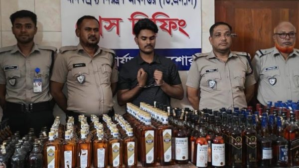 যশোর প্রতিনিধি : যশোরে মাদকদ্রব্য নিয়ন্ত্রণ অধিদপ্তরের মাদকবিরোধী অভিযানে ২৬৫ বোতল বিদেশি মদসহ এক যুবককে গ্রেফতার করা হয়েছে। রোববার (৯ নভেম্বর ২০২৫) রাত সাড়ে দশটার দিকে যশোর খুলনা রোডে, যশোর সদরের বসুন্দিয়া ঘুনি রাস্তার মোড় রেলগেট সংলগ্ন যমুনা ফিড এলাকার প্রতিষ্ঠানের উত্তর পাশ থেকে তাকে আটক করা হয়।