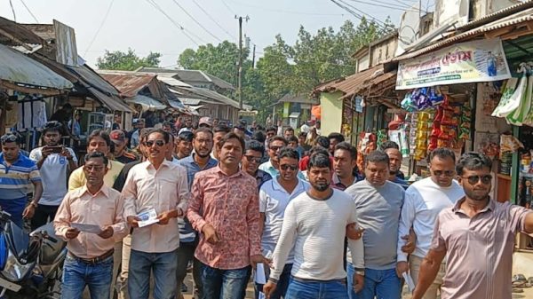 তালা প্রতিনিধি : সাতক্ষীরা-১ (তালা-কলারোয়া) আসনে বাংলাদেশ জাতীয়তাবাদী দল (বিএনপি) মনোনীত প্রার্থী ও সাবেক সংসদ সদস্য হাবিবুল ইসলাম হাবিবের পক্ষে ধানের শীষে ভোট চেয়ে লিফলেট বিতরণ করা হয়েছে। বৃহস্পতিবার (১৩ নভেম্বর) সকালে তালা বাজারে উপজেলা যুবদল, স্বেচ্ছাসেবক দল ও ছাত্রদলের উদ্যোগে এ লিফলেট বিতরণ ও গণসংযোগ কর্মসূচি অনুষ্ঠিত হয়। এ সময় উপজেলা যুবদলের যুগ্ম আহ্বায়ক সাইদুর রহমান সাইদ, ফারুক জোয়াদ্দার, সৈয়দ আজম, কেন্দ্রীয় ছাত্রদলের সাবেক যুগ্ম সাধারণ সম্পাদক এস. এম. মারুফুল ইসলাম, উপজেলা স্বেচ্ছাসেবক দলের আহ্বায়ক রফিকুল ইসলাম, সদস্য সচিব আবুল কালাম, ছাত্রদলের আহ্বায়ক হাফিজুর রহমান, তালা থানা ছাত্রদলের সদস্য সচিব এস. কে. ফারুক, তালা সরকারি কলেজ ছাত্রদলের সভাপতি সোহাগ হোসেন, যুবদল নেতা শাহীন, মাস্টার নাসির উদ্দিন, প্রভাষক এম. মোস্তাক আহমেদ, জাহাঙ্গীর হোসেন, রেজা, মোস্তাফিজুর রহমান মোখলেছ ও হাফিজসহ অন্যান্য নেতাকর্মীরা উপস্থিত ছিলেন। এ সময় লিফলেট বিতরণ ও গণসংযোগে নেতৃবৃন্দ ভোটারদের কাছে ধানের শীষে ভোট দেওয়ার আহ্বান জানান। তারা বলেন, সাবেক সংসদ সদস্য হাবিবুল ইসলাম হাবিব নির্বাচিত হলে এলাকায় উন্নয়নমূলক কর্মকাণ্ড আরও গতিশীল হবে।