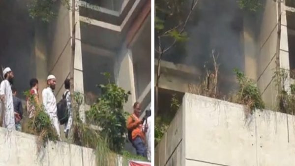বৃহস্পতিবার (১৩ নভেম্বর) কার্যক্রম নিষিদ্ধ আওয়ামী লীগের নৈরাজ্যের প্রতিবাদে বাংলাদেশ ইসলামী ছাত্রশিবির এবং জুলাই যোদ্ধা সংসদের অবস্থান কর্মসূচি থেকে বিক্ষুব্ধরা এ আগুন ধরান। এ সময় পরিত্যক্ত ভবনের দেওয়ালে ভাস্কর্যেও ভাঙচুর চালান বিক্ষুব্ধরা।