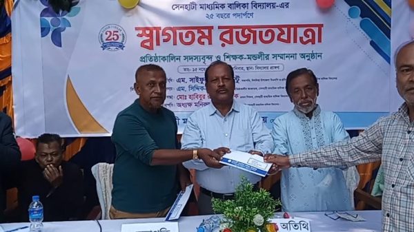 দিঘলিয়া প্রতিনিধি : দিঘলিয়া উপজেলা সেনহাটি মাধ্যমিক বালিকা বিদ্যালয় ২৫ বছরে পদার্পণে রজতযাত্রা প্রতিষ্ঠাকালিন সদস্যবৃন্দ ও শিক্ষক-মন্ডলীর সম্মাননা অনুষ্ঠান অনুষ্ঠিত হয়। শনিবার বিদ্যালয় প্রাঙ্গণে অনুষ্ঠানের প্রধান অতিথি ছিলেন দিঘলিয়া উপজেলা বিএনপি’র সভাপতি এম সাইফুর রহমান মিন্টু। সেনহাটী মাধ্যমিক বালিকা বিদ্যালয়ের সভাপতি অধ্যক্ষ মনিরুল হক বাবুলের সভাপতিত্বে এবং বিদ্যালয়ের প্রতিষ্ঠাকালীন আহবায়ক এম. সিদ্দিক-উজ-জামানের সঞ্চালনায় উপস্থিত ছিলেন উপজেলা বিএনপির সাংগঠনিক সম্পাদক মোল্লা নাজমুল হোসেন, আলমগীর হোসেন আলম, সৈয়দ রাশেদুজ্জামান, আবু দাউদ, মোহাম্মদ আলী মিন্টু, অধ্যাপক সিরাজুল ইসলাম, আব্দুস সালাম, আরিফুল ইসলাম হাসান, সৈয়দ আব্দুল হাই সোহেল, মাস্টার নজির আহমেদসহবিদ্যালয়ের শিক্ষক ছাত্রী সহ অভিভাবকবৃন্দ। অনুষ্ঠানে স্বাগত বক্তব্য রাখেন সেনহাটী মাধ্যমিক বালিকা বিদ্যালয়ের প্রধান শিক্ষক মোঃ হাবিবুর রহমান মল্লিক।