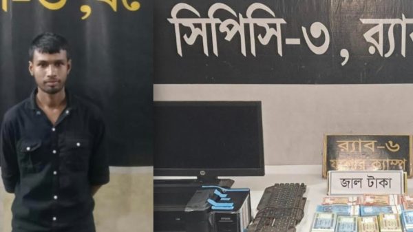 যশোর প্রতিনিধি : যশোরের মনিহার এলাকা থেকে চার লাখ ২৯ হাজার ৬০০ টাকার জাল নোট এবং জাল টাকা তৈরির সরঞ্জাম উদ্ধার করেছে র্যাব-৬, সিপিসি-৩। এ ঘটনায় ইব্রাহিম গাজি (১৯) নামে এক যুবককে গ্রেফতার করা হয়েছে। শুক্রবার রাত সাড়ে বারোটার দিকে র্যাব যশোর ক্যাম্পের পাঠানো এক প্রেস বিজ্ঞপ্তিতে এ তথ্য জানানো হয়।