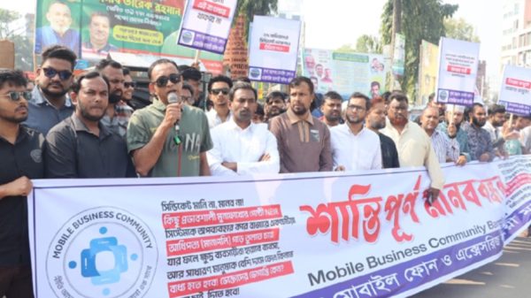 আজ সোমবার (২৪ নভেম্বর) সকাল থেকে দোকান বন্ধ রেখে মহানগরীর প্রাণকেন্দ্র শিববাড়ির মোড়ে খুলনা মহানগর মোবাইল ফোন ও অ্যাক্সেসরিজ ব্যবসায়ী মালিক সমিতির উদ্যোগে মানববন্ধন করেন তারা।