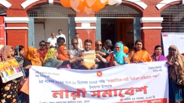 আন্তর্জাতিক নারী নির্যাতন প্রতিরোধ পক্ষের এবারের প্রতিপাদ্য ‘নারী ও কন্যার প্রতি সহিংসতা বন্ধে ঐক্যবদ্ধ হই, ডিজিটাল নিরাপত্তা নিশ্চিত করি’। নারী সমাবেশে অতিথিরা বলেন, আমরা চাই নারীর প্রতি সহিংসতা ও নির্যাতন বন্ধ হউক। নারী নির্যাতন কমিয়ে আনার জন্য নারীদের সক্ষমতা বাড়াতে হবে। নারীদের অর্থনৈতিক সক্ষমতা বৃদ্ধি পেলে তাদের উপর নির্যাতন স্বাভাবিকভাবে বন্ধ হয়ে যাবে। তারা নিজেদের অধিকারের কথা বলতে পারবে। নারী-পুরুষের মধ্যে এখন কোন ভেদাভেদ নেই। নারীরা ঘরে ও বাইরে গুরুত্বপূর্ণ দায়িত্ব পালন করে যাচ্ছেন। নারী নির্যাতন দূরের কথা, নারীদের কিভাবে যোগ্য সম্মান দেয়া যায় তা সমাজের ভাবা উচিত। নারীরা মানুষ হিসেবে নতুন বাংলাদেশে নতুনভাবে বাঁচতে পারবে এই প্রত্যাশা ব্যক্ত করেন অতিথিরা। আন্তর্জাতিক নারী নির্যাতন প্রতিরোধ পক্ষ উপলক্ষ্যে নারী সমাবেশের উদ্বোধন করেন খুলনার অতিরিক্ত জেলা প্রশাসক (সার্বিক) বিতান কুমার মন্ডল। সমাবেশে মহিলা বিষয়ক দপ্তরের উপপরিচালক (অতিরিক্ত দায়িত্ব) সুরাইয়া সিদ্দীকা, নারী নেত্রী অ্যাডভোকেট শামীমা সুলতানা শিলুসহ নারী সংগঠনের প্রতিনিধিরা বক্তৃতা করেন। অনুষ্ঠানে বিভিন্ন বেসরকারি নারী সংগঠন, এনজিও ও স্বেচ্ছাসেবী সংস্থার প্রতিনিধিরা অংশগ্রহণ করে। উল্লেখ্য, আগামী ১০ ডিসেম্বর পর্যন্ত ‘আন্তর্জাতিক নারী নির্যাতন প্রতিরোধ পক্ষ’ চলবে।
