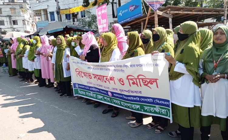 বৃহস্পতিবার (২৭ নভেম্বর) সকালে শহরের খুলনা রোড মোড় আসিফ চত্বরে সামনে বিক্ষোভ ও মানববন্ধন অনুষ্ঠিত হয়। সাতক্ষীরা জেলা শাখার সভাপতি ডালিয়া পারভীনের সভাপতিত্বে আয়োজিত মানববন্ধনে বক্তব্য রাখেন অ্যাসোসিয়েশনের সাধারণ সম্পাদক নাসিমা খাতুন, কোষাধ্যক্ষ মাহমুদুল হাসান, স্বাস্থ্য পরিদর্শক ও মিডওয়াইফারি প্রতিনিধি নাসরিন খালেদ, ছাত্র-ছাত্রী প্রতিনিধি চঞ্চলা রানীসহ অন্যান্য নেতৃবৃন্দ।