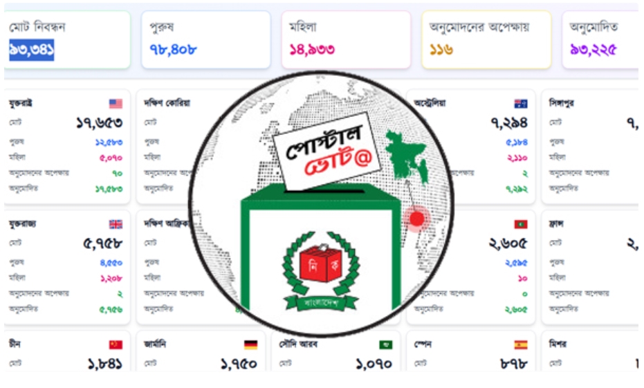 ডেস্ক রিপোর্ট : আসন্ন ত্রয়োদশ জাতীয় সংসদ নির্বাচনে প্রবাসীদের ভোটাধিকার নিশ্চিতে অনলাইনে নিবন্ধন কার্যক্রম পরিচালনা করছে নির্বাচন কমিশন (ইসি)। এতে এখন পর্যন্ত বিভিন্ন দেশ থেকে ভোট দেওয়ার জন্য ‘পোস্টাল ভোট বিডি’ অ্যাপে প্রবাসী নিবন্ধন ছাড়িয়েছে ৯৩,৩৪১ হাজার।
