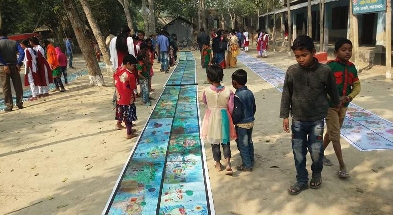 ২০১৮ সালে শিল্পাঞ্জলি’র শিশু-কিশোর চিত্রশিল্পীদের অংকিত বিশাল এই চিত্রটির ৪০০ ফুট অংশ ডিজিটাল প্যানা প্রিন্টে রূপ দেয়া হয়। এরপর শুরু হয় নড়াইল ও যশোরের প্রত্যন্ত গ্রাম অঞ্চলের প্রাইমারি ও মাধ্যমিক স্কুলগুলিতে শিল্পাঞ্জলি’র ক্ষুদে শিল্পীদেও অংকিত বড়চিত্রের ভ্রাম্যমাণ প্রদর্শনী। এ পর্যন্ত যেসব প্রত্যন্ত গ্রামাঞ্চলে ভ্রাম্যমাণ শিশুচিত্র প্রদর্শনী হয়েছে সে গুলির মধ্যে রয়েছে আগদিয়া, মালিয়াট, ভবানীপুর, টাবরা, গোবরা, গুয়াখোলা, বাকড়ী, সীতারামপুর, মুশুড়ি, বাহিরগ্রাম, মুলিয়া ও হিজলডাঙ্গা। উল্লেখ্য এসব গ্রামাঞ্চলের প্রাইমারি ও মাধ্যমিক স্কুল মিলে মোট ২৭টি স্কুলে শিল্পাঞ্জলি’র শিশুশিল্পীদের অঙ্কিত বড় চিত্রের ডিজিটাল প্যানা প্রদর্শিত হয়েছে।