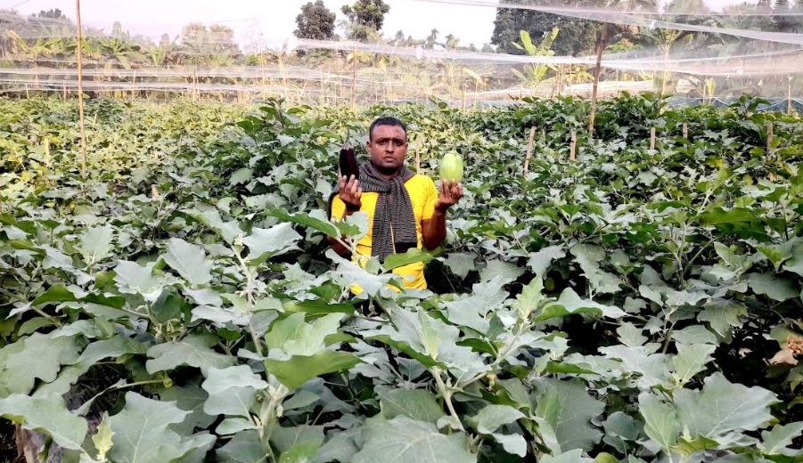 ফকিরহাট প্রতিনিধি : বাগেরহাটের ফকিরহাট উপজেলার মৌভোগ গ্রামের কৃষক মুরাদ হালদার প্রথমবার আধুনিক পদ্ধতিতে বেগুন চাষে অভূতপূর্ব সাফল্য পেয়েছেন। অর্গানিক বেগুন চাষে তার সাফল্য দেখে অভিভূত এলাকার মানুষ। মুরাদ হালদার উপজেলার নলধা-মৌভোগ ইউনিয়নের মৌভোগ গ্রামের একজন যুবক। ওই গ্রামে ছুনটের মোড় এলাকায় তার ছোট একটি সার ওষুধের দোকান রয়েছে। তিনি এবছর অন্যের জমি বর্গা নিয়ে আধুনিক পদ্ধতিতে অর্গানিক বেগুন চাষ শুরু করেছেন। উপজেলা কৃষি বিভাগের পরামর্শে তিনটি প্লটে ৫৫ কাঠা জমিতে আধুনিক পদ্ধতিতে চার জাতের বেগুন চাষ করেন তিনি। এতে তার খরচ পড়েছে ১ লাখ ৪৭ হাজার টাকা। ইতোমধ্যে ১৮ কাঠার একটি বেগুন ক্ষেত থেকে তিনি ২ লাখ ৬৫ হাজার টাকার বেগুন বিক্রি করেছেন। পূর্ণমাত্রায় উৎপাদনে গেলে তিনটি প্লটে থেকে ৭ থেকে ৮ লাখ টাকার বেগুন বিক্রি করতে পারবেন বলে তিনি আশা করছেন। এ যেন প্রথমবারেই বাজিমাতের ঘটনা। মুরাদ হালদার বলেন, ‘‘বেগুন চাষ করে এত লাভ হবে, কখনো ভাবিনি। আগামীতে দুই বিঘা জমিতে বেগুন চাষ করব। সবচেয়ে বড় কথা, এই বেগুন অর্গানিক ও বিষমুক্ত। কারণ, বেগুনের জমিতে কোনো কীটনাশক ও রাসয়নিক সার ব্যবহার করা হয়নি।’’উপজেলার মৌভোগ গ্রামের কৃষক মুরাদ হালদারের একটি ১৮ কাঠার বেগুন ক্ষেতে গিয়ে দেখা যায়, প্রায় ২৫ থেকে ৩০ মণ বেগুন ক্ষেত থেকে তোলা হয়েছে। ৯ জন শ্রমিক বেগুনগুলো আকার অনুযায়ী গ্রেডিং করে বস্তায় ভরছেন। ঢাকা ও মাদারীপুর থেকে ট্রাকযোগে ক্ষেতের পাশে পাইকার এসেছেন বেগুন কিনতে। আসে পাশের ক্ষেতে প্রতি কেজি বেগুনের পাইকারী দাম ৫০ টাকা হলেও এই বেগুন বিক্রি হচ্ছে ৬৫ থেকে ৭০ টাকায়। বিষমুক্ত অর্গানিক ফসল হওয়ায় খেতে সুস্বাদু, চাহিদা ও দাম বেশি বলে জানান পাইকার ইব্রাহীম শেখ। প্রতি ৫ থেকে ৭ দিন পর তিনি এই ক্ষেত থেকে ২৫ থেকে ৩০ মণ বেগুন তোলেন। বাকী দুটি ক্ষেতের উৎপাদন শুরু হলে সপ্তাহে ৭০ থেকে ৮০ মণ বেগুণ পাবেন বলে জানান চাষী মুরাদ। মুরাদ হালদারের চাষকৃত বেগুন ক্ষেতগুলো পাশে ও উপর থেকে সুক্ষ্ম জাল দিয়ে ঘেরা রয়েছে যাতে সহজে পোকামাকড় ঢুকতে না পারে। তাছাড়া পোকা মাকড়ের প্রাকৃতিক বালাইনাশক হিসেবে সেক্স ফেরোমন ফাঁদ, কিউট্রাক ফাঁদ, ট্রাইকোডার্মা, স্টিকি ইয়োলো কার্ড ইত্যাদি ব্যবহার করেছেন। রাসয়নিক সারের বদলে জমিতে জৈব সার প্রয়োগ করেছেন। মাটির আদ্রতা ধরে রাখতে ও আগাছার প্রকোপ কমাতে মাটিতে মালচিং পেপার ব্যবহার করেছেন। ফলে সেচ খরচ প্রায় অর্ধেকে নেমে এসছে বলে জানান কৃষক মুরাদ হালদার। তিনি তার তিনটি ক্ষেতে ভারতের উচ্চফলনশীল ও রোগ প্রতিরোধ ক্ষমতা সম্পন্ন ‘চক্র বিএন ৪২২’ জাত, হায়দারাবাদের ‘নবকিরণ’ জাত, উচ্চ মূল্যের ‘ভিএনআর ২১২’ জাত এবং গ্রীণবল জাতের বেগুন চাষ 