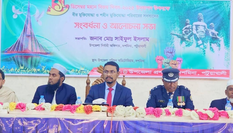 দশমিনা(পটুয়াখালী) প্রতিনিধি : পটুয়াখালীর দশমিনা উপজেলায় মহান বিজয় দিবসে উপজেলা প্রশাসনের উদ্যোগে পরিষদের মিলনায়তনে মুক্তিযোদ্ধাদেরকে সংবর্ধনা প্রদান করা হয়। উপজেলার বীর মুক্তিযোদ্ধাদেরকে রজনীগন্ধা ফুল দিয়ে বরন করা পর প্রত্যেকের হাতে উপহার সামগ্রী তুলে দেয়া হয়। সংবর্ধনা অনুষ্ঠানে প্রধান অতিথি ছিলেন উপজেলা নির্বাহী কর্মকর্তা মো.সাইফুল ইসলাম। অনুষ্ঠানে বিশেষ অতিথি ছিলেন সহকারী কমিশনার(ভূমি)আবদুল্লাহ আল মামুন। অনুষ্ঠানে অন্যান্যদের মধ্যে উপস্থিত ছিলেন উপজেলা স্বাস্থ্য ও পরিবার পরিকল্পনা কর্মকর্তা ডাঃ মো. মোস্তাফিজুর রহমান, উপজেলা কৃষি কর্মকর্তা কৃষিবিদ মো. জাফর আহমেদ,উপজেলা বিএনপির সাধারন সম্পাদক শাহ আলম শানু,প্রেসক্লাবের সভাপতি ও দৈনিক আজকের পত্রিকা প্রতিনিধি মো.বেল্লাল হোসেন,দশমিনা রিপোর্টাস ইউনিটির সাধারন সম্পাদক ও দৈনিক নয়াদিগন্ত প্রতিনিধি সঞ্জয় ব্যানার্জি,প্রমুখ। এছাড়া দশমিনা সরকারী মডেল মাধ্যমিক বিদ্যালয়ের মাঠে অনুষ্ঠিত ডিসপ্লে, রচনা প্রতিযোগিতা অনুষ্ঠানে উপজেলা নির্বাহী কর্মকর্তা আবদুল্লাহ আল মামুন বিজয়ীদের মাঝে পুরস্কার বিতরন করেন।