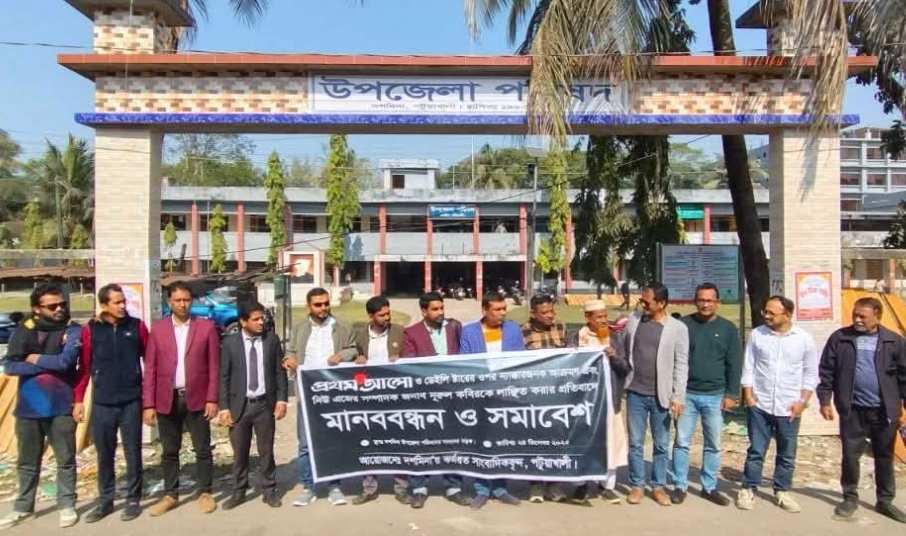 দশমিনা(পটুয়াখালী) প্রতিনিধি : পটুয়াখালীর দশমিনা উপজেলায় স্থানীয় গণমাধ্যমকর্মীদের উদ্যোগে দৈনিক প্রথম আলো ও ডেইলি ষ্টারের উপর ন্যাক্কারজনক হামলা এবং নিউ এজের সম্পামক নুরুল কবিরকে হেনস্তা করার প্রতিবাদে আজ বুধবার ২৪ ডিসেম্বর সকালে ১১ টায় মানববন্ধন ও সমাবেশ অনুষ্ঠিত হয়। উপজেলা পরিষদের সামনে প্রধান সড়কের পাশে দাড়িয়ে স্থানীয় গণমাধ্যমকর্মীরা এই মানববন্ধন ও সমাবেশ করেছে। মানববন্ধন ও সমাবেশ অনুষ্ঠানে উপস্থিত ছিলেন দৈনিক ইত্তেফাকের পটুয়াখালী জেলা দক্ষিন প্রতিনিধি মো.কামরুর ইসলাম সোহাগ,দশমিনা প্রেসক্লাবের সিনিয়র সহ-সভাপতি ও দৈনিক সংবাদ প্রতিনিধি আহাম্মদ ইব্রাহিম অরবিল, দশমিনা প্রেসক্লাবের সভাপতি মো.বেল্লাল হোসেন, দৈনিক সমকাল প্রতিনিধি রিপন কুমার কর্মকার, দশমিনা রিপোটার্স ইউনিটির সভাপতি ফয়েজ আহমেদ,সাধারন সম্পাদক সঞ্জয় ব্যানার্জি, দশমিনা সাংবাদিক সমিতির সাধারন সম্পাদক মো.মামুন তানভীর,দৈনিক মানবজমিন প্রতিনিধি মো.সাফায়েত হোসেন প্রমুখ।