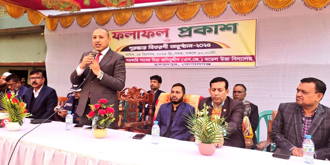 মুকসুদপুর প্রতিনিধি : গোপালগঞ্জের মুকসুদপুরে সরকারি সাবের মিয়া জসিমুদ্দিন (এসজে) মডেল উচ্চ বিদ্যালয়ের বার্ষিক পরীক্ষার ফলাফল প্রকাশ ও পুরস্কার বিতরণী অনুষ্ঠান অনুষ্ঠিত হয়েছে। বুধবার (২৪ ডিসেম্বর) সকাল ১০টায় বিদ্যালয় প্রাঙ্গণের খোলা মঞ্চে এ অনুষ্ঠানের আয়োজন করা হয়। অনুষ্ঠানে প্রধান অতিথি হিসেবে উপস্থিত ছিলেন মাহমুদ আশিক কবির, উপজেলা নির্বাহী অফিসার ও বিদ্যালয় পরিচালনা কমিটির সভাপতি। বিদ্যালয়ের প্রধান শিক্ষক সুনীল চন্দ্র মন্ডল-এর সভাপতিত্বে এবং সহকারী শিক্ষক সুকদেব পোদ্দার-এর সঞ্চালনায় অনুষ্ঠানে বিশেষ অতিথি হিসেবে বক্তব্য রাখেন মুকসুদপুর থানার অফিসার ইনচার্জ আব্দুল্লাহ আল মামুন, উপজেলা কৃষি কর্মকর্তা মো. মিজানুর রহমান, উপজেলা প্রাণিসম্পদ কর্মকর্তা ডা. জাহাঙ্গীর আলম, উপজেলা যুব উন্নয়ন কর্মকর্তা সায়াদ উদ্দিন আহম্মেদ, উপজেলা প্রাথমিক শিক্ষা কর্মকর্তা এম. এ. নইম, উপজেলা প্রকল্প বাস্তবায়ন কর্মকর্তা আব্দুল কাদের, সরকারি মুকসুদপুর কলেজের সমাজবিজ্ঞান বিভাগের বিভাগীয় প্রধান মাহবুব হাসান বাবর, সাপ্তাহিক বাংলার নয়নের সম্পাদক শহিদুল ইসলাম বেলায়েত এবং মুকসুদপুর প্রেসক্লাবের সভাপতি মো. ছিরু মিয়া। এছাড়াও উপস্থিত ছিলেন মুকসুদপুর প্রেসক্লাবের সাধারণ সম্পাদক কাজী মো. ওহিদুল ইসলাম, যুগ্ম সম্পাদক আরেফিন মুক্তা, অভিভাবকবৃন্দ ও বিদ্যালয়ের শিক্ষক-শিক্ষার্থীরা। অনুষ্ঠান শেষে তৃতীয় শ্রেণি থেকে দশম শ্রেণি পর্যন্ত বার্ষিক পরীক্ষায় কৃতিত্বপূর্ণ ফল অর্জনকারী প্রথম, দ্বিতীয় ও তৃতীয় স্থান অধিকারী শিক্ষার্থীদের মাঝে পুরস্কার বিতরণ করা হয়। এসময় অতিথিবৃন্দ শিক্ষার্থীদের উদ্দেশ্যে দিকনির্দেশনামূলক বক্তব্য দেন এবং তাদের উজ্জ্বল ভবিষ্যৎ কামনা করেন।