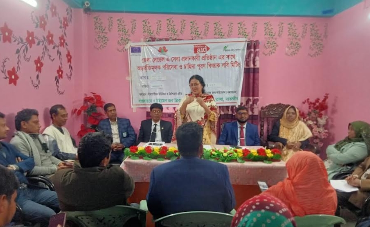 তালা প্রতিনিধি : দাতা সংস্থা ইউরোপিয়ান ইউনিয়ন ও খ্রীষ্টান এইডের অর্থায়নে এবং মানুষের জন্য ফাউন্ডেশনের সহযোগিতায় ও উইমেন জব ক্রিয়েশন সেন্টারের বাস্তবায়নে বিভিন্ন পরিসেবা দানকারী প্রতিষ্ঠানের সাথে সেবা অর্ন্তভুক্তি বিষয়ে লবি সভা অনুষ্ঠিত হয়। বুধবার (২৪ ডিসেম্বর) সাতক্ষীরা জেলা মহিলা বিষয়ক অধিদপ্তরের হলরুমে অনুষ্ঠিত সভায় সভাপতিত্ব করেন মহিলা বিষয়ক অধিদপ্তরের উপ-পরিচালক নাজমুন নাহার। অনুষ্ঠান এড. মুনিরুদ্দিনের সঞ্চালনায় সভায় অধিদপ্তরের প্রোগ্রাম অফিসার ফাতিমাতুজ্জোহরা, ওসিসি আব্দুল হাই, জেলা তথ্য অফিসার জাহারুল হক, এড. মুনিরউদ্দিন, এড. সাকিবুর রহমান বাবলা, এড. খায়রুল বদরুজ্জামান, নারী নেত্রী ফরিদা আক্তার লাকী, নাগরিক কমিটির আমিনুর রহমান বাবলুসহ অনেকেই গুরুত্বপূর্ণ বক্তব্য রাখেন। প্রেজেন্টশন উপস্থাপন করেন প্রকল্প সমন্বয়কারী কাজী বাবর আলী। সার্বিক সহযোগিতায় ছিলেন প্রশান্ত কুমার ঘোষ, তানজিলা খাতুন।সমাপনী বক্তব্যে সভাপতি উইমেন জব ক্রিয়েশন সেন্টার সেন্টারের কার্যক্রমের প্রসংশা করেন এবং সমাজে পিছিয়ে রাখা নারীদের উন্নয়নে কর্মসূচি অব্যাহত রাখার আহ্বান জানান।