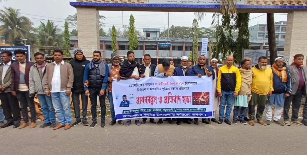 দশমিনা(পটুয়াখালী) প্রতিনিধি : পটুয়াখালীর দশমিনা উপজেলায় দীপু দাস হত্যার ঘটনায় মানববন্ধন ও প্রতিবাদ সভা অনুষ্ঠিত হয়। গতকাল শনিবার সকাল ১০টায় উপজেলা পরিষদের প্রধান সড়কে সর্বস্তরের জনগনের ব্যানারে এই কর্মসূচী পালন করা হয়। ময়মনসিংহ জেলার ভালুকা উপজেলায় ধর্ম অবমাননার মিথ্যা অভিযোগে দীপু চন্দ্র দাসকে পিটিয়ে হত্যা পরবর্তী মরদেহ গাছে ঝুলিয়ে আগুনে পোড়ানেরা ঘটনায় মানববন্ধন ও প্রতিবাদ সভায় অংশগ্রহনকারীরা তীব্র নিন্দা জানিয়ে দ্রুত বিচার এবং দোষীদেরকে দৃষ্টান্তমূলক শাস্তির দাবী করেন। মানববন্ধন শেষে প্রতিবাদ সভায় বক্তব্য রাখেন উপজেলা বিএনপির সাধারন সম্পাদক শাহ আলম শানু,যুগ্ন সাধারন সম্পাদক মো.ফখরুজ্জামান বাদল,যুবদলের আহবায়ক এডভোকেট এনামুল হক রতন,সদস্য সচিব শামীম খান,ছাত্রদলের সাবেক সভাপতি আল আমিন মোল্লা,গণ অধিকার পরিষদের পটুয়াখালী জেলা যুগ্ন আহবায়ক আবুল কালাম পঞ্চায়েত, হিন্দু বৌদ্ধ খ্রিষ্টান ঐক্য পরিষদের সভাপতি এডভোকেট উত্তম কুমার কর্মকার,সাধারন সম্পাদক দেবাশিষ রতন মজুমদার,সাংবাদিক ফয়েজ আহমেদ,সঞ্জয় ব্যানার্জি, সাফায়েত হোসেন,পুরোহিত ননী গোপাল চক্রবর্তী,বেতাগী-সানকিপুর ইউনিয়ন পরিষদের সাবেক সদস্য পশারী রানী প্রমুখ।