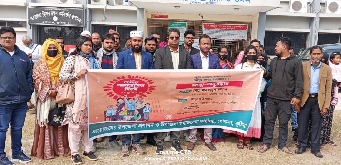 খোকসা প্রতিনিধি: "প্রযুক্তি ও মমতায়, কল্যাণ ও সমতায়, আস্থা আজ সমাজসেবায়" এই প্রতিপাদ্যকে সামনে রেখে সারা দেশের ন্যায় কুষ্টিয়ার খোকসা উপজেলায় জাতীয় সমাজসেবা দিবস পালিত হলো।