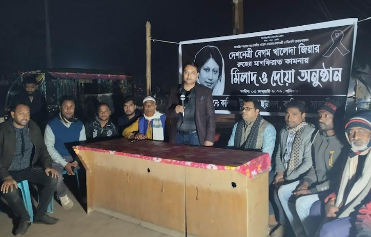 সাতক্ষীরা প্রতিনিধিঃ বাংলাদেশ জাতীয়তাবাদী ছাত্রদল কালিগঞ্জ উপজেলা শাখার উদ্যোগে সাতক্ষীরার কালিগঞ্জ দক্ষিণ পাড় ফুলতলা ধানের শীষের নির্বাচনী অফিসে বিএনপি চেয়ারপার্সন, সাবেক প্রধানমন্ত্রী, দেশনেত্রী বেগম খালেদা জিয়ার রুহের মাগফেরাত কামনায় মিলাদ ও দোয়া অনুষ্ঠিত হয়েছে। ৩ জানুয়ারী (শনিবার) বাদ মাগরিব কালিগঞ্জ উপজেলা ছাত্রদলের সিনিঃ যুগ্ম আহবায়ক শফিউল আলম মিলন এর সভাপতিত্বে ও যুগ্ম আহবায়ক জাকির হোসেন ও আব্দুল্লাহ আল মামুন এর যৌথ সঞ্চালনায় দোয়া অনুষ্ঠানে প্রধান অতিথি হিসেবে উপস্থিত ছিলেন জাতীয়তাবাদী যুবদল যুক্তরাজ্য শাখার তথ্য ও গবেষণা সম্পাদক, বিশিষ্ট সমাজসেবক ব্যারিস্টার শেখ নাসির উদ্দীন। বিশেষ অতিথি হিসেবে উপস্থিত ছিলেন কুশুলিয়া ইউনিয়ন বিএনপির সভাপতি ইঞ্জিনিয়ার মোঃ হাসানুর রহমান, তারালী ইউনিয়ন বিএনপির সাধারন সম্পাদক গনিয়ার রহমান গনি, কুশুলিয়া ইউনিয়ন বিএনপির সহ-সভাপতি শেখ হাবিবুল্লাহ, সহ-সভাপতি মোঃ মিজানুর রহমান, উপজেলা ছাত্রদলের সাবেক সাধারণ সম্পাদক রেদওয়ান ফেরদৌস রনি, উপজেলা তাঁতীদলের সাধারন সম্পাদক মোঃ ফারুক হোসেন, উপজেলা তরুন দলের সভাপতি শেখ আলমগীর কবীর, সাধারন সম্পাদক শাহিনুর রহমান, সহ-সভাপতি আব্দুস সালাম, উপজেলা তাঁতী দলের সহ-সভাপতি শেখ আমজাদ হোসেন, কুশুলিয়া ২ নং ওয়ার্ড বিএনপির সাধারন সম্পাদক মোঃ হাসান গাজী, সাংগঠনিক সম্পাদক শেখ নাসিরউদ্দীন, ১ নং ওয়ার্ড বিএনপির যুগ্ম সম্পাদক সাদ্দাম হোসেন, উপজেলা জিয়া সাইবার ফোর্স এর সদস্য সচিব রবিউল ইসলাম, কালিগঞ্জ সরকারী কলেজ ছাত্রদলের সভাপতি তাজকিন মেহেদী তাজ, সহ-সভাপতি তৌহিদ হোসেন, যুগ্ম সম্পাদক আব্দুস সাকুর হৃদয়, উপজেলা যুবদলের সদস্য মনিরুজ্জামান মনি ও কুশুলিয়া ইউনিয়ন যুবদল আহবায়ক শেখ ইয়াছিন আলী, উপজেলা স্বেচ্ছাসেবক দলের সদস্য শেখ ইসমাইল হোসেন, যুবদল নেতা রাইছুল ইসলাম, শাহিন আলম প্রমূখ।