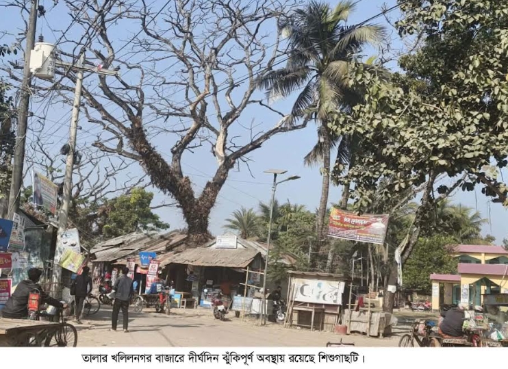 তালা প্রতিনিধি : সাতক্ষীরার তালা উপজেলার খলিলনগর বাজারের প্রাণকেন্দ্রে মহান্দি-কাশিমনগর বাজার আঞ্চলিক সড়কের পাশে মৃত শিশুগাছটি ব্যবসায়ী, কোমলমতি শিক্ষার্থী ও পথচারীদের গলার কাঁটা হয়ে দাঁড়িয়েছে। যে কোনো সময় বড় শুকনা ডাল ভেঙে মানুষের জীবনহানির মতো ঘটনা ঘটতে পারে বলে স্থানীয়দের ধারণা। এ ব্যাপারে স্থানীয় ইউপি সদস্য, ব্যবসায়ী ও পথচারীরা উপজেলা নির্বাহী কর্মকর্তা কাছে গাছটি অপসারণের দাবী জানিয়েছেন।