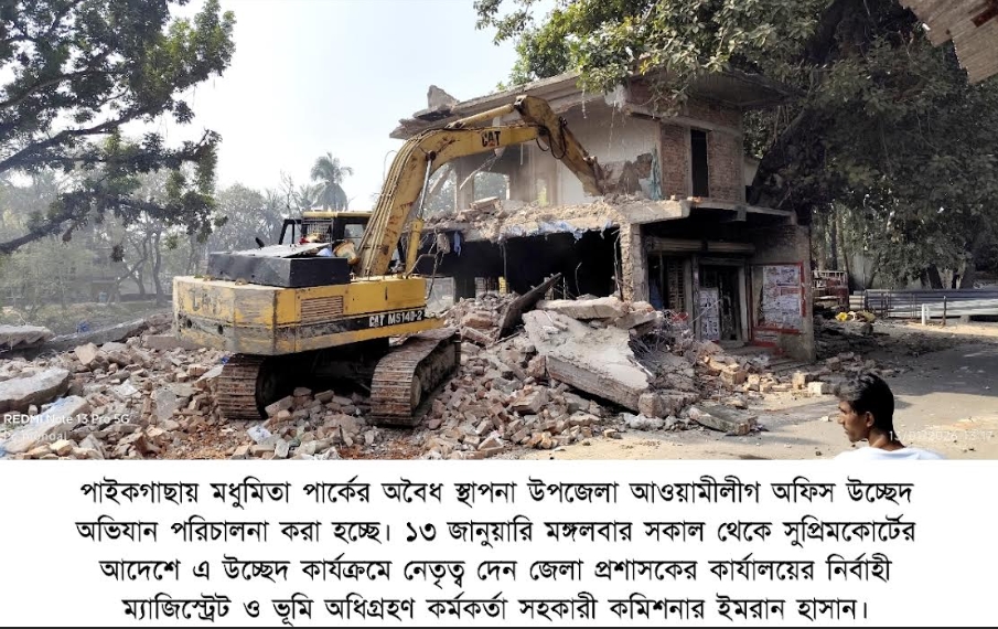 পাইকগাছা প্রতিনিধি : খুলনার পাইকগাছায় জেলা পরিষদের মালিকানাধীন মধুমিতা পার্কের জমিতে অবৈধভাবে গড়ে তোলা উপজেলা আওয়ামী লীগের অফিস মঙ্গলবার (১৩ জানুয়ারি) সকালে বুলডোজার দিয়ে উচ্ছেদ করা হয়েছে।
