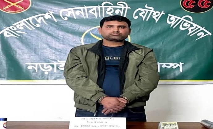 নড়াইল প্রতিনিধি: নড়াইলের লোহাগড়ায় সেনাবাহিনীর অভিযানে মাদক কারবারী আসলাম শেখ (৩৮)কে আটক করা হয়েছে। সেনা সদস্যরা আটককৃত ব্যক্তির কাছ থেকে ২৫০ পিস নিষিদ্ধ মাদক ইয়াবা ট্যাবলেট, দুটি স্মার্টফোন এবং নগদ ৩৮ হাজার ৯২০ টাকা উদ্ধার করেন। পরবর্তীতে আটক ব্যক্তি ও জব্দকৃত মালামাল আইনানুগ ব্যবস্থা গ্রহণের জন্য লোহাগড়া থানায় হস্তান্তর করা হয়। আটক আসলাম শেখ গোপালগঞ্জ জেলার কাশিয়ানী উপজেলার শংকরপাশা গ্রামের আজগর শেখের ছেলে। বুধবার (১৪ জানুয়ারি) লোহাগড়া থানার ইন্সপেক্টর (তদন্ত) অজিত রায় বিষয়টি নিশ্চিত করে বলেন, আটক মাদক কারবারিকে আদালতের মাধ্যমে জেল-হাজতে পাঠানো হয়েছে। মঙ্গলবার (১৩ জানুয়ারি) রাত সাড়ে ১০টায় গোপন সংবাদের ভিত্তিতে নড়াইল আর্মি ক্যাম্পের ক্যাম্প কমান্ডার মেজর মাজহারুল ইসলামের নেতৃত্বে এ অভিযান পরিচালিত হয়। সেনা সদস্যরা লোহাগড়া উপজেলার টি-চর কালনা সরকারি প্রাথমিক বিদ্যালয় এলাকায় তল্লাশি অভিযান চালিয়ে মাদক ব্যবসায়ী আসলামকে আটক করেন।