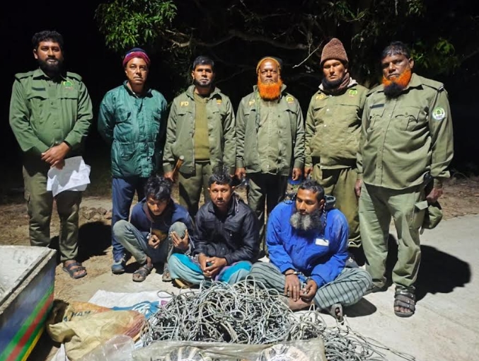 বনবিভাগ সূত্রে জানা যায়, সুন্দরবন পূর্ব বন বিভাগের কচিখালী অভয়ারণ্য কেন্দ্রের ভারপ্রাপ্ত কর্মকর্তা ফরেস্টার মোঃ মিজানুর রহমানের নেতৃত্বে বনরক্ষীরা মঙ্গলবার (১৩ জানুয়ারী) রাত দশটার দিকে নদীতে নিয়মিত টহলের সময়। সুন্দরবনের কচিখালীর বাহির সুকপাড়ায় একটি ইঞ্জিন চালিত ট্রলারকে থামাতে সংকেত দিলে ট্রলারটি সুন্দরবনের পাশে ভিড়িয়ে ট্রলার থেকে লাফিয়ে পড়ে চারজন শিকারী সুন্দরবনের মধ্যে পালিয়ে যায়। এ সময় বনরক্ষীরা ট্রলার থেকে অপর তিনজনকে আটক করতে সক্ষম হয়। বনরক্ষীরা ট্রলারে তল্লাশি করে ৬০০ ফুট হরিণ ধরার মালা ফাঁদ একটি ককশিট, দুইটি ছুরি, দশটি প্লাস্টিকের বস্তাসহ হরিণ শিকারের আনুষঙ্গিক সরঞ্জাম জব্দ করেন। আটক শিকারিরা হচ্ছে, অলিউল ইসলাম গাজী (৪৩), ইমরান গাজী (১৮) ও কামাল গাজী (৪১)।এদের বাড়ী পাথরঘাটার কোড়ালিয়া গ্রামে।