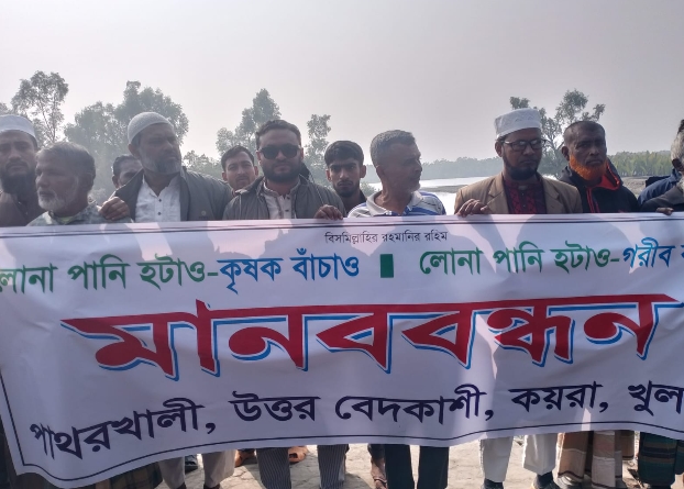 কয়রা (খুলনা) প্রতিনিধি: “লোনা পানি হটাও, কৃষক বাঁচাও”—এই স্লোগানকে সামনে রেখে লোনা পানি উত্তোলন বন্ধের দাবিতে খুলনার কয়রা উপজেলার উত্তর বেদকাশী ইউনিয়নের পাথরখালি গ্রামবাসীর উদ্যোগে মানববন্ধন কর্মসূচি পালিত হয়েছে। শনিবার (১৭ জানুয়ারি) বেলা ১১টায় উত্তর বেদকাশী পাথরখালি লোনা পানির গই (গেট) সংলগ্ন শাকবাড়িয়া নদীর পাউবো বেড়িবাঁধ এলাকায় এ মানববন্ধন অনুষ্ঠিত হয়।
