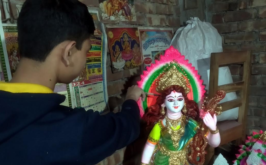 ফকিরহাট প্রতিনিধি : বাগেরহাটের ফকিরহাটে চলছে আসন্ন সরস্বতী পূজার ব্যাপক প্রস্তুতি। প্রতিমা শিল্পীরা নিখুঁত হাতের কারুকার্য দিয়ে সকাল থেকে গভীর রাত পর্যন্ত তৈরি করছেন প্রতিমা। প্রতিমা শিল্পীরা তুলির আঁচড়ে সরস্বতী প্রতিমার মুখ ফুটিয়ে তুলছেন। ফকিরহাট উপজেলার আট্টাকীর পালপাড়া ঘুরে দেখা গেছে, বর্তমানে ব্যস্ত সময় পার করছেন প্রতিমা শিল্পীরা। শিল্পীর নিপুণ হাতে চলছে প্রতিমা তৈরির কাজ। রাতদিন পরিশ্রম করে মাটি দিয়ে দেবীর অবয়ব নির্মাণ করছেন কারিগররা। পূজার সময় যতই ঘনিয়ে আসছে ততই ব্যস্ত হয়ে পড়ছেন তারা। এছাড়া, অন্যন্য বছরের ন্যায় শিক্ষা প্রতিষ্ঠানে বিদ্যা ও জ্ঞানের দেবী সরস্বতী প্রতিমার চাহিদা রয়েছে। মৃৎশিল্পীদের বাড়ি থেকেই অনেকে প্রতিমা কিনে নিয়ে যাচ্ছেন। অনুরূপ অনেক বাড়ি, মন্দির ও প্রতিষ্ঠান থেকে প্রতিমা নেওয়ার জন্য বাড়িতে আসছেন। কয়েকজন মৃতশিল্পীরা জাানান, দ্রব্যমূল্যের উর্ধ্বগতির বাজারে পরিশ্রমের পর প্রতিমা তৈরি করে যে মজুরি পান তা দিয়ে জীবন যাপন করা কষ্টকর হয়ে পড়ছে। অনেকেই এ পেশা ছেড়ে অন্য পেশায় চলে গেছেন। প্রতিমা শিল্পী জিৎ পাল জানান, তারা এ বছর ছোট-বড় ২২০ টি প্রতিমা তৈরী করেছেন। অধিকাংশ প্রতিমায় রং করা হয়েছে গেছে। পূজার আগে সকল প্রতিমার রং করা শেষ হবে। প্রতিমা শিল্পী লিটন পাল জানান, প্রতিমায় এখন চলছে রং তুিলর কাজ চলছে। অন্যান্য বছরের তুলনায় এ বছর প্রতিমা তৈরির জিনিস পত্রের মুল্য বেশী। সে তুলনায় প্রতিমার দাম পাচ্ছেন না বলে জানান। প্রতিমা শিল্পী বিমল পাল ও অর্চনা পালসহ কয়েকজন প্রতিমা শিল্পীরা জানান, অন্য বারের তুলনায় এ বছর প্রতিমা তৈরী কম করেছেন। যে গুলো তৈরী করা হয়েছে তা অধিকাংশই অগ্রীম অর্ডার রয়েছে। এছাড়া অন্য প্রতিমা বিভিন্ন হাটে বিক্রি করবেন। এদিকে সনাতন ধর্মবলম্বীদের বিদ্যা, জ্ঞান ও সুরের সরস্বতী দেবীকে বরণে প্রস্তুতি নিচ্ছে বিভিন্ন মন্দির, বাড়ি ও শিক্ষা প্রতিষ্ঠান। যথাযথ ধর্মীয় রীতি ও আচার মেনে পূজা উদযাপনের জন্য অধির আগ্রহে অপেক্ষা করছে শিক্ষার্থী ও ভুক্তকুল।