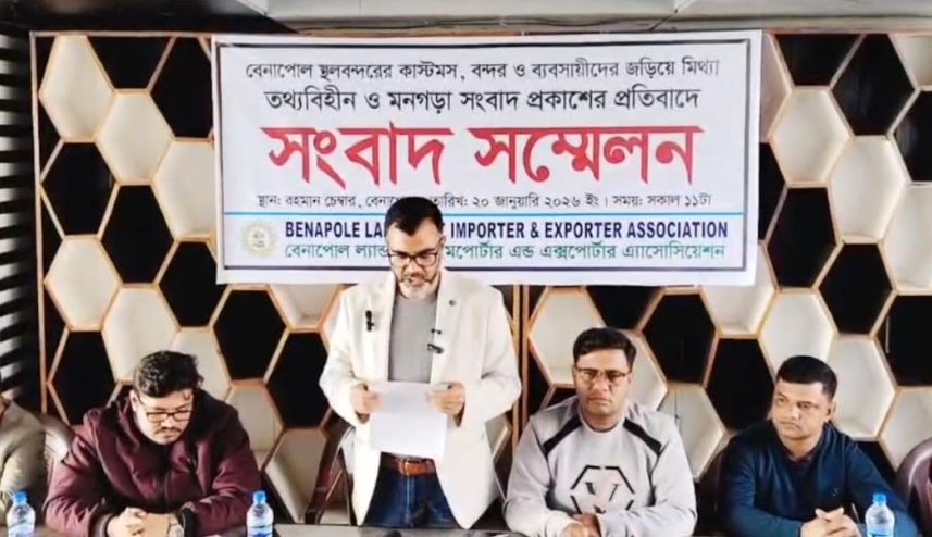 যশোর প্রতিনিধি : বেনাপোল স্থলবন্দরকে কেন্দ্র করে কাস্টমস, বন্দর কর্তৃপক্ষ ও বৈধ ব্যবসায়ীদের বিরুদ্ধে মিথ্যা, বিভ্রান্তিকর ও উদ্দেশ্যপ্রণোদিত সংবাদ প্রকাশের প্রতিবাদে সংবাদ সম্মেলন অনুষ্ঠিত হয়েছে। একই সঙ্গে মামলা ও চার্জশিট দাখিলের পরও বহিরাগত চাঁদাবাজদের দৌরাত্ম্য অব্যাহত থাকায় তীব্র উদ্বেগ প্রকাশ করেছেন ব্যবসায়ীরা। মঙ্গলবার (২০ জানুয়ারি) দুপুরে বেনাপোল রহমান চেম্বারের দি সান রুফে এই সংবাদ সম্মেলনের আয়োজন করে বেনাপোল ল্যান্ড পোর্ট ইমপোর্টার অ্যান্ড এক্সপোর্টার অ্যাসোসিয়েশন। লিখিত বক্তব্য পাঠ করেন সংগঠনের সাধারণ সম্পাদক জিয়াউর রহমান জিয়া।