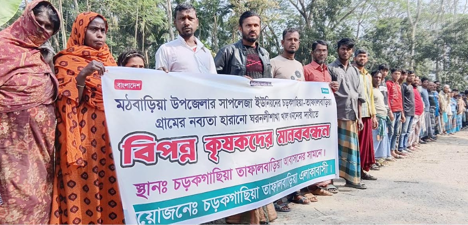 মঠবাড়িয়া (পিরোজপুর) প্রতিনিধিঃ পিরোজপুরের মঠবাড়িয়ার সাপলেজা ইউনিয়নের ঘরনলী খালের নব্যতা হারিয়ে যাওয়ায় বছরের পর বছর অনাবাদি থাকে প্রায় চার হাজার একর জমি। এছাড়া শুকনো মৌসুমে পানির অভাবে চরম দুর্ভোগ পোহাতে হয় কয়েক হাজার গ্রামবাসীর। এলাকাবাসীর দুর্ভোগ লাঘব ও ফসলী জমি চাষাবাদের সুবিধার্থে সম্প্রতি পানি উন্নয়ন বোর্ড সাপলেজা ইউনিয়নের ঘরনলীশাখা খালের প্রায় দুই কিলোমিটার খনন কাজ শুরু করেন। কিন্তু এলাকার কতিপয় লোকের বাঁধার মুখে খাল খনন কাজ বন্ধ হয়ে যায়। এর প্রতিবাদে প্রায় পাঁচ শতাধিক বিক্ষুব্দ কৃষক ও এলাকারবাসী শনিবার সকালে চরকগাছিয়া-তাফালবাড়িয়া সড়কে মানববন্ধন শেষে বিক্ষোভ মিছিল করেন। মানবন্ধনে খাল খনন কাজে বাঁধা দানের প্রতিবাদ জানিয়ে বক্তব্য রাখেন সমাজ সেবক জাকির দর্জি, কৃষক হারুন অর রশিদ দফাদার, জসিম হাওলাদার, শহীদুল ইসলাম চাপরাশী, মোঃ বাদল মিয়া ও শংকর মিত্র প্রমুখ। এসময় বক্তরা বলেন, চরকগাছিয়া-তাফালবাড়িয়া এলাকার ঘরনলী খাল ভরাট হয়ে যাওয়ায় জলবদ্ধতার কারণে প্রতি বছর প্রায় চার হাজার একর জমি অনাবাদি থাকে। অপর দিকে শুকনো মৌসুমে পানির অভাবে দুর্ভোগ পোহাতে হয় কয়েক হাজার গ্রামবাসীর। কৃষক শংকর মিত্র জানান, কৃষক ও এলাকাবাসীর দুর্ভোগের কারণে পানি উন্নয়ন বোর্ড এ খাল খননের কাজ শুরু করেন। কিন্তু কতিপয় লোক এতে বাঁধা দিচ্ছেন। যদি খাল খনন কাজ বন্ধ হয়ে গেলে এলাকার মানুষের চরম দুর্ভোগ পোহাতে হবে।