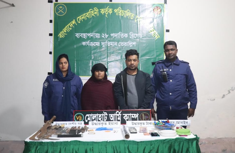 মোল্লাহাট (বাগেরহাট) প্রতিনিধিঃ বাগেরহাটের মোল্লাহাট উপজেলায় আর্মির নেতৃত্বাধীন যৌথবাহিনীর অভিযানে তানিয়া আক্তার (৩৭) ও মহিবুল্লাহ (৩০) নামে এক নারী ও এক পুরুষকে মাদকদ্রব্য ও দেশীয় অস্ত্রসহ আটক করা হয়েছে।
