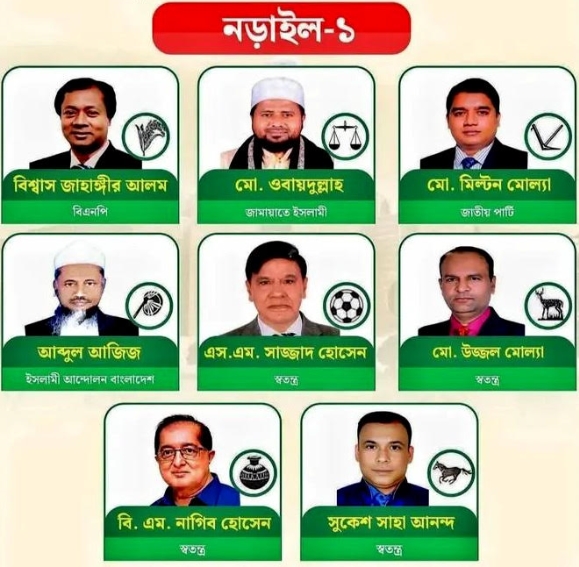 নড়াইল-১ আসনে বিএনপি মনোনীত প্রার্থী বিশ্বাস জাহাঙ্গীর আলম নির্বাচন করছেন ধানের শীষ প্রতীকে। বাংলাদেশ জামায়াতে ইসলামীর প্রার্থী মাওলানা মো. ওবায়দুল্লাহ কায়সার প্রতিদ্বন্দ্বিতা করছেন দাঁড়িপাল্লা প্রতীকে। ইসলামী আন্দোলন বাংলাদেশের প্রার্থী আব্দুল আজিজ পেয়েছেন হাতপাখা প্রতীক। জাতীয় পার্টির প্রার্থী মো. মিল্টন মোল্লা লড়ছেন লাঙ্গল প্রতীকে।