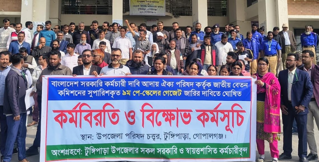 টুঙ্গিপাড়ায় ৯ম পে-স্কেলের দাবিতে সরকারি কর্মচারীদের কর্মবিরতি ও বিক্ষোভ