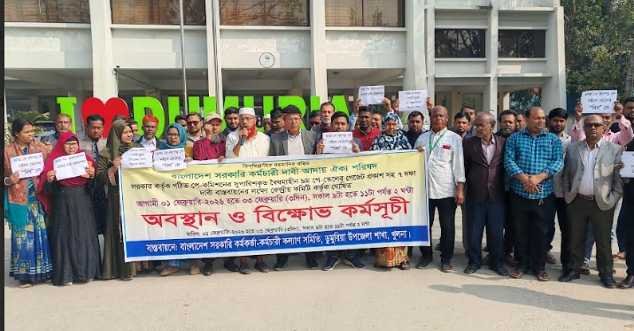 ডুমুরিয়া (খুলনা) প্রতিনিধি: ৯ম পে-স্কেলের গেজেট প্রকাশসহ ৭ দফা দাবির বাস্তবায়নের দাবিতে ডুমুরিয়ায় অবস্থান ও বিক্ষোভ কর্মসূচি পালন করেছে বাংলাদেশ সরকারি কর্মকর্তা-কর্মচারী কল্যাণ সমিতি, ডুমুরিয়া উপজেলা শাখা।