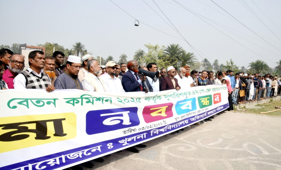 খুবি প্রতিনিধি: জাতীয় বেতন কমিশন-২০২৫ কর্তৃক সুপারিশকৃত ৯ম পে স্কেল বাস্তবায়নের দাবিতে মানববন্ধন কর্মসূচি পালন করেছে খুলনা বিশ্ববিদ্যালয় অফিসার্স কল্যাণ পরিষদ। আজ মঙ্গলবার দুপুর বিশ্ববিদ্যালয়ের মেইন গেটের শহিদ মীর মুগ্ধ তোরণের সামনে এ মানববন্ধন কর্মসূচি পালিত হয়। মানববন্ধনে সভাপতিত্ব করেন অফিসার্স কল্যাণ পরিষদের সাধারণ সম্পাদক এস এম মোহাম্মদ আলী।