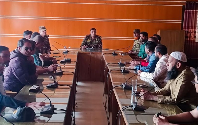 দশমিনা(পটুয়াখালী)প্রতিনিধি : পটুয়াখালীর দশমিনা উপজেলায় গত মঙ্গলবার সকালে সেনাবাহিনীর ক্যাম্পের হলরুমে স্থানীয় সাংবাদিকদের সঙ্গে এক মতবিনিময় সভা অনুষ্ঠিত হয়। ত্রয়োদশ জাতীয় সংসদ নির্বাচন সুষ্ঠু ও সুশৃঙ্খলভাবে সম্পন্ন করার লক্ষ্যে আইন শৃঙ্খলা পরিস্থিতিসহ সার্বিক বিষয়ে বাংলাদেশ সেনাবাহিনী দশমিনা কন্টিনজেন্ট কমান্ডার মেজর তানজিল’র সাথে এই মতবিনিময় সভা অনুষ্ঠিত হয়। মতবিনিময় সভায় স্থানীয় সাংবাদিকদের মধ্যে উপস্থিত ছিলেন দশমিনা প্রেসক্লাবের সভাপতি ও দৈনিক আজকের পত্রিকার প্রতিনিধি মো.বেল্লাল হোসেন,সাধারন সম্পাদক ও দৈনিক আমাদের সময় প্রতিনিধি শাহাজাদা তোহামিন,দৈনিক মানবজমিন প্রতিনিধি মো.সাফায়েত হোসেন প্রমুখ।