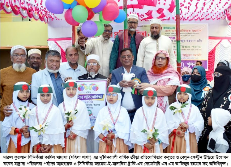 বিজ্ঞপ্তি : দারুল কুরআন সিদ্দিকীয়া কামিল মাদ্রাসা (মহিলা শাখা) এর বার্ষিক ক্রীড়া প্রতিযোগিতা অনুষ্ঠিত হয়েছে। শুক্রবার (৬ ফেব্রুয়ারি) সকাল ৯ টায় মাদ্রাসার মাঠ প্রাঙ্গণে প্রধান অতিথি হিসেবে উপস্থিত থেকে কবুতর ও বেলুন-ফেস্টুন উড়িয়ে দু’দিনব্যাপী বার্ষিক ক্রীড়া প্রতিযোগিতার উদ্বোধন করেন মাদ্রাসা পরিচালনা পর্ষদের আহবায়ক ও সিদ্দিকীয়া জামেয়া-ই-মাদানিয়া ট্রাস্ট-এর সেক্রেটারি এস এম আজিজুর রহমান।