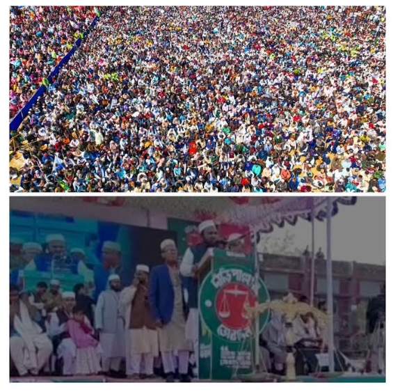 সাতক্ষীরা প্রতিনিধি : আগামী ১২ ই ফেব্রুয়ারি জাতীয় সংসদ নির্বাচন উপলক্ষে সাতক্ষীরা সংসদীয় ৪আসন শ্যামনগর ৭ ফেব্রুয়ারি সকাল ১১ টায় দাঁড়িপাল্লার প্রার্থী গাজী নজরুল ইসলামের নির্বাচনী মহাসমাবেশ অনুষ্ঠিত হয়। মহাসমাবেশে শ্যামনগর উপজেলা ১২ইউনিয়ন সহ পার্শ্ববর্তী কালিগঞ্জ দেবহাটা ও আশাশুনি উপজেলা থেকে আশা লক্ষ্য মানুষের ঢল নামে। সকাল থেকে বেলা যতো বাড়তে থাকে শ্যামনগর হরিচরণ সরকারি পাইলট হাই স্কুল ,মাঠ শ্যামনগর সরকারি মহসিন কলেজ মাঠ ,শ্যামনগর জাতীয় ঈদগা মাঠ, লোকে লোকারণ্য হয়ে পড়ে। অনেকে মাঠে জায়গা না পেয়ে সড়কের পাশে অবস্থান নিয়ে মহাসমাবেশের বক্তাদের বক্তব্য শুনে। মহাসমাবেশে নারীদের উপস্থিতিও ছিল চোখে পড়ার মতো। সামনে দিয়ে প্রত্যক্ষদর্শীদের বর্ণনা শ্যামনগরের ইতিহাসে সবচেয়ে বড় মহাসমাবেশ অনুষ্ঠিত হয়েছে। শ্যামনগরের দাড়িপাল্লার মহাসমাবেশের বড় আকর্ষণ ছিল কেন্দ্রীয় জামায়াতের সহকারী জেনারেল,মোয়াজ্জেম হোসেন হেলাল,বাংলাদেশ ছাত্র শিবিরের সাধারণ সম্পাদক সিগবাতুউল্লাহ শিগবা, ঢাকা বিশ্ববিদ্যালয়ের সদ্য নির্বাচিত ভিপি সাদেক কাইয়ুম ও বাংলাদেশের জামায়াতে ইসলামের একমাত্র সংখ্যালঘু মনোনীত খুলনা ১আসনের প্রার্থী কৃষ্ণ নন্দর উপস্থিতি। উক্ত সমাবেশে সভাপতিত্ব করেন শ্যামনগর উপজেলা জামাতের আমির মাওলানা আব্দুর রহমান, প্রধান অতিথির বক্তব্য রাখেন বাংলাদেশ জামায়াতে ইসলামের কেন্দ্রীয় সহকারি সেক্রেটারি জেনারেল মোয়াজ্জেম হোসেন হেলাল, বিশেষ অতিথি হিসেবে উপস্থিত হয়ে বক্তব্য রাখেন বাংলাদেশ জামায়তে ইসলামের কেন্দ্রীয় ছাত্র শিবিরের সেক্রেটারি জেনারেল সিগাবাতুল্লাহ সিগবা, বক্তব্য রাখেন বিশেষ অতিথি হিসেবে বর্তমান সময়ের আলোচিত ছাত্রশিবিরের ঢাকা বিশ্ববিদ্যালয়ের সদ্যনির্বাচিত ভিপি সাদিক কাইয়ুম , বক্তব্য রাখেন বাংলাদেশ জামায়াতে ইসলামের কেন্দ্রীয় নেতা শ্যামনগরের কৃতি সন্তান বিশিষ্ট দানবীর খলিলুর রহমান, বক্তব্য রাখেন খুলনায় ১ আসনের জামায়াতে ইসলামের মনোনীত প্রার্থী বাবু কৃষ্ণানন্দ, বক্তব্য রাখেন সাতক্ষীরা জেলা জামায়াতের নায়েবে আমির শহিদুল ইসলাম, বক্তব্য রাখেন সাতক্ষীরা জেলা জামায়াতের সেক্রেটারি জেনারেল মাওলানা আজিজুর রহমান,। প্রধান অতিথি কেন্দ্রীয় সহকারী সেক্রেটারি জেনারেল মোয়াজ্জেম হোসেন হেলাল তার বক্তব্যে বলেন জামায়াতে ইসলাম সরকার গঠন করলে এ দেশের সংখ্যালঘুদের ও মা-বোনদের সার্বিক নিরাপত্তা সহ সব ধরনের সুযোগ সুবিধা প্রদান করা হবে। নারীরা যাতে বিভিন্ন কর্ম ক্ষেত্রে এগিয়ে যেতে পারে জামায়াতে ইসলাম তার জন্য যুগান্তকারী পদক্ষেপ গ্রহণ করবে।, তিনি আরো বলেন বাংলাদেশ শুধু ইসলামের রাষ্ট্র নয